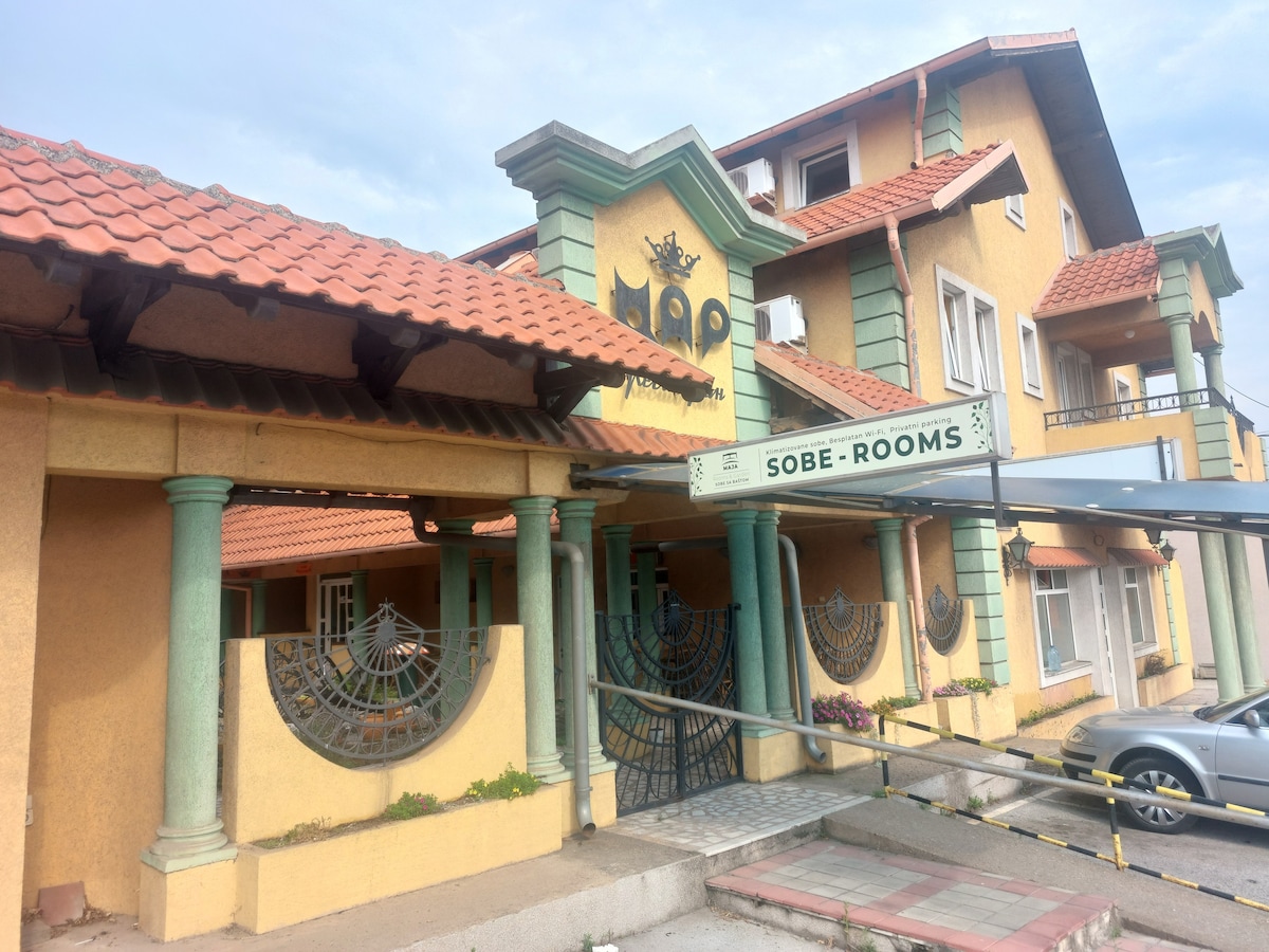 Maja Rooms & Garden is a peaceful oasis only 800m from Smederevo center. Perfect for business teams, workers, and groups! Why choose us: *Prime Location: Just a short walk (800m) to the city center and main attractions. *Large Private Parking: Secure on-site parking, ideal for cars and vans. *Full Comfort: 13 rooms with AC, TV, and fast Wi-Fi. *Extra Perks: Beautiful shared garden and access to a washing machine. Clean, quiet, and professional service for your best stay in Smederevo.