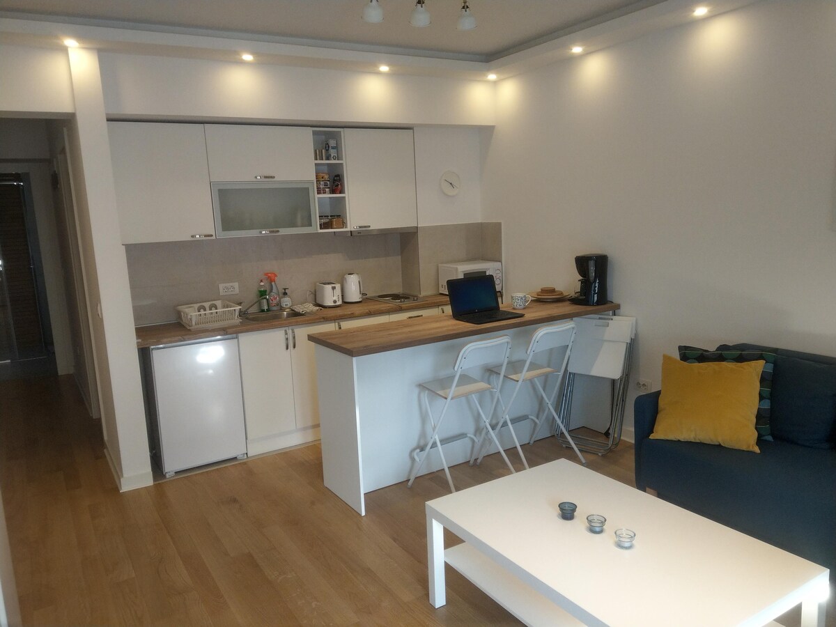The apartment is full renovated a few months ago and everything is brand new. In the bedroom there is a large comfortable double bed and one big sofa bed in the living room. All in discreet led light. In the kitchen you can enjoy a modern flat-screen cooker, oven, refrigerator with freezer, dishwasher and washing machine and a large bar table. The bathroom is glazed with marble ceramics, it is very compact and clean. The bathroom is equipped with a hairdryer, towels, hygiene sets.