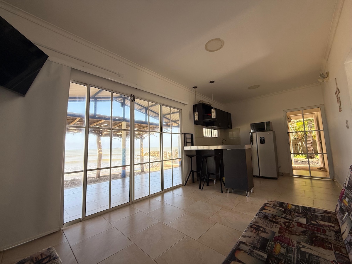 Cabaña de dos plantas entera precio igual 1 a 6 huéspedes, 4 alcobas con aire acondicionado, 4 baños, cocina integral, sala, barra comedor, zona labores, terrazas, balcón, piscina, kiosko, canchas deportivas (voleibol sobre arena, baskets, microfutbol, etc.), frutales, represas, playa privada, playa para niños. Area total terreno 1 ha.