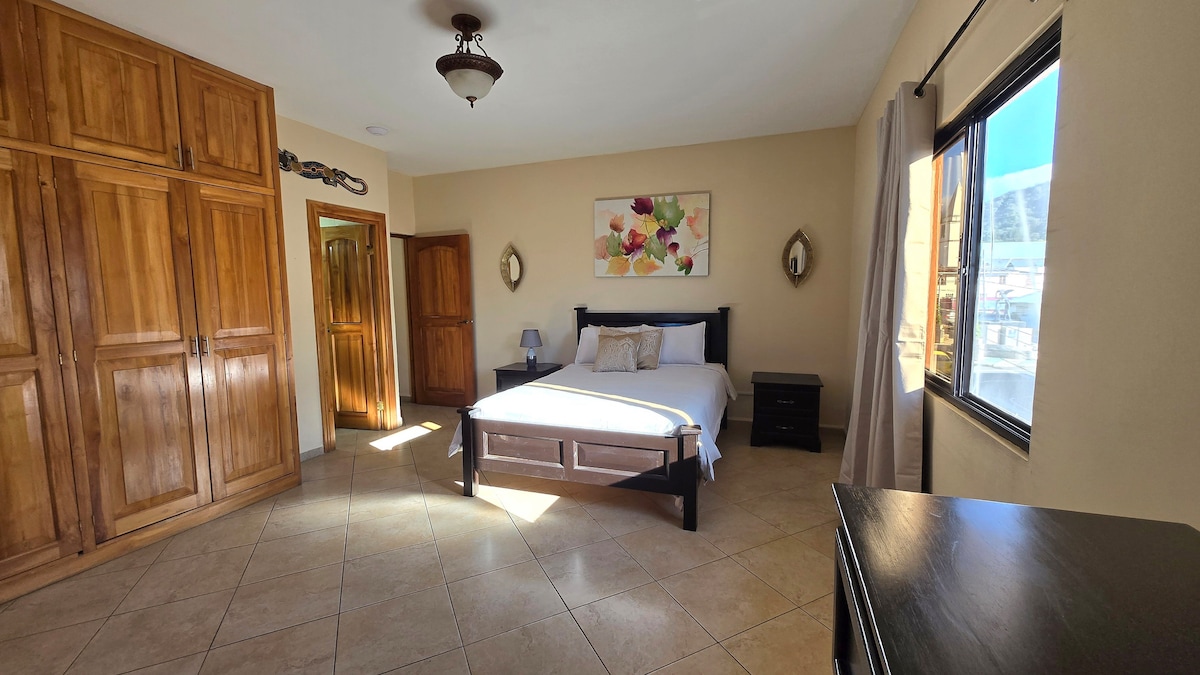 Luxurious one bedroom apartment with incredible view from above to town at CASA EJECUTIVA BOQUETE. A full kitchen, 1.5 bathrooms, 2 king sized beds, 1 queen bed and section to entertain guests. It has a full wrap around balcony and is extremely secure, with the only entrance being a single heavy oak door. Fast primary internet connection (~100mbps), backup internet connection, solar panels, and water tanks on site. We never lose water or power. No stairs for this apartment.