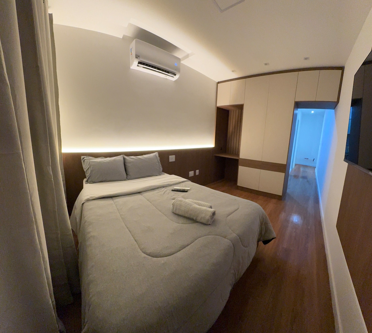 Flat novo em área nobre, moderno e completo. Acesso fácil para deficientes físicos. Possui ar-condicionado, black-out na janela, Wi-Fi e espaço de trabalho. Cozinha equipada : geladeira, micro-ondas, cafeteira, eletrodomésticos e fogão por indução. Roupa de cama, ferro de passar e lavanderia no prédio (uso pago). TV com canais fechados. Prédio com câmeras de segurança, detector de fumaça, elevador e estacionamento gratuito na rua. Ideal para quem busca conforto, praticidade e ótima localização.