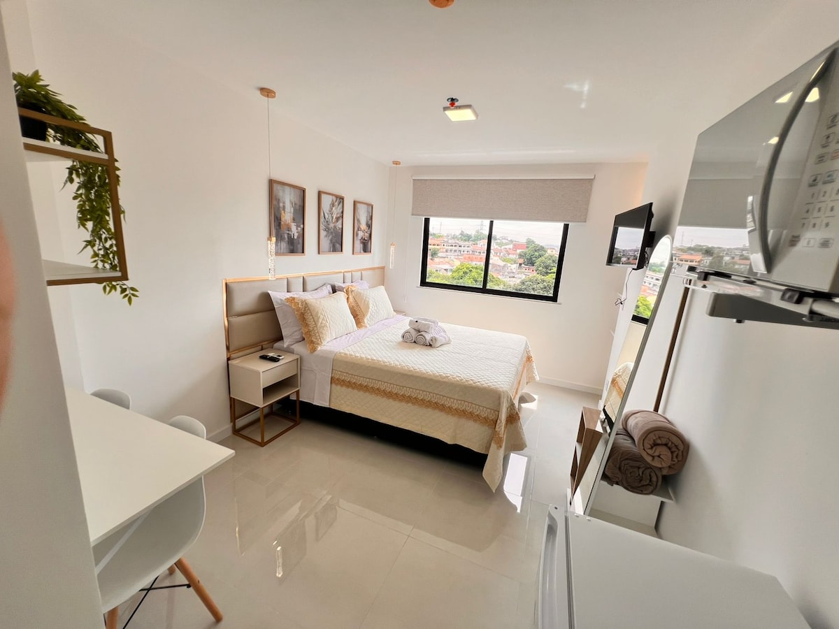 Um estúdio novinho, bem montado em bairro tranquilo, muito próximo ao Hospital Unimed e ao maior shopping da região sul fluminense, o Park Sul. O deslocamento para os centros comerciais de Volta Redonda (Vila, Aterrado e Centro) levam no máximo 10 minutos. Roupa de cama, banho, louças e utensílios novos. Micro-ondas, Airfryer, Geladeira e Ar Condicionado para seu conforto e tranquilidade. O prédio possui lavanderia self-service cobrada à parte. Fácil de encontrar vaga para automóvel na rua.