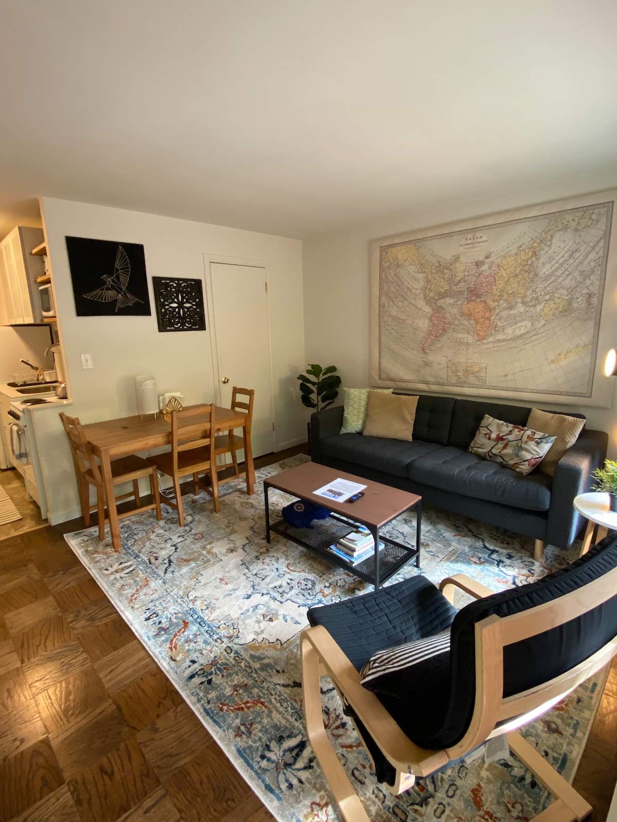 Gorgeous updated 1902 Dutch Colonial with unique loft-style feel. You have entire main floor with outdoor patio. Perfect for a couple, two couples or single relocating (with lots of storage), or friends/family up to five. Both bedrooms have new queen beds with their own full baths (one with a two-person shower, the other a tub), with Starck low-flow toilets. Beds have locally made high-quality down duvets with allergy protectors on mattresses and pillows and quality soft microfiber sheets. Extra-long couch in living room sleeps a fifth guest. One bedroom has a long couch for an extra guest in-room. Pack-n-play crib for infants/toddlers.