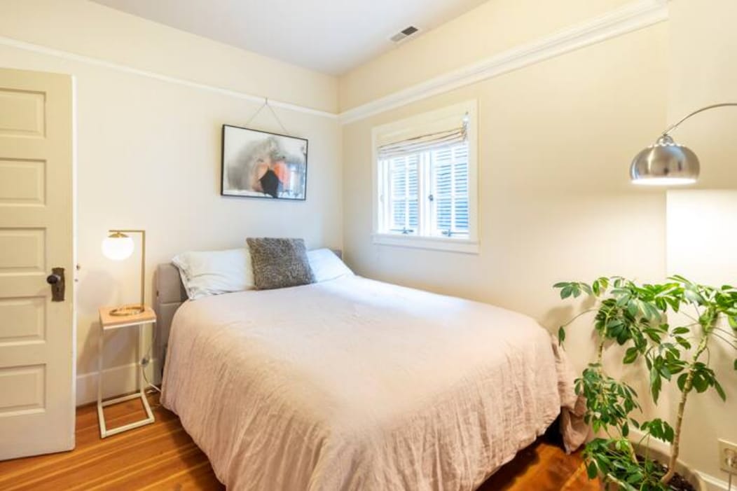 Gorgeous updated 1902 Dutch Colonial with unique loft-style feel. You have entire main floor with outdoor patio. Perfect for a couple, two couples or single relocating (with lots of storage), or friends/family up to five. Both bedrooms have new queen beds with their own full baths (one with a two-person shower, the other a tub), with Starck low-flow toilets. Beds have locally made high-quality down duvets with allergy protectors on mattresses and pillows and quality soft microfiber sheets. Extra-long couch in living room sleeps a fifth guest. One bedroom has a long couch for an extra guest in-room. Pack-n-play crib for infants/toddlers.