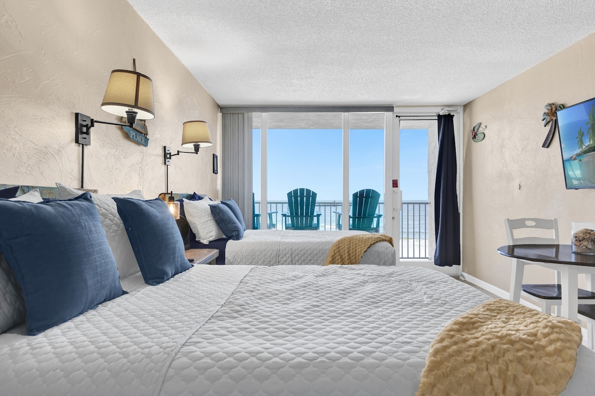 *** Brand new pool and beach access are open!*** Welcome to Daytona Beach Bliss! Enjoy our newly renovated studio just steps from the beach. Located in Daytona Beach Club, this cozy studio sleeps 4 with a queen bed and a pull out couch. The space is best suited for 2 adults or a family with 2 adults and 1-2 kids. The 5th floor balcony has a beautiful side ocean view and city views.