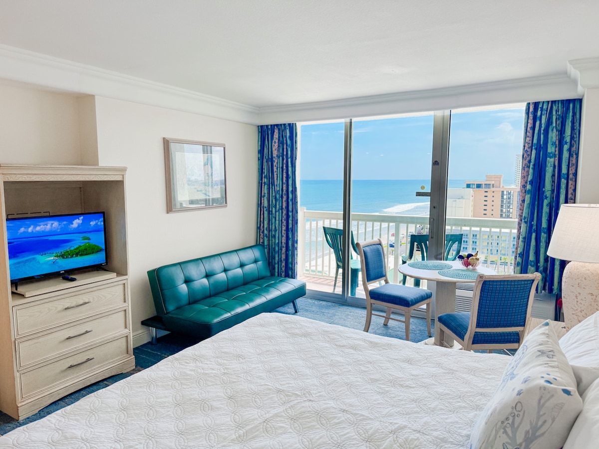 We are one of the closest airbnb to the boardwalk, OnThe Worlds Most Famous Beach with an open Pool 65inch Tv Come enjoy our Newly Furnished Studio with Amazing Top Floor Beach Views. We are the Closest AIRBNB on the Beach to the Daytona International Speedway With king bed and Queen sleeper sofa. Centrally located in the Heart of Daytona Beach. walking distance to the Pier Boardwalk, Restaraunts, and Main Street We have FREE parking for 1 vehicle and provide Coffee,Cream,Sugar,bch chairs
