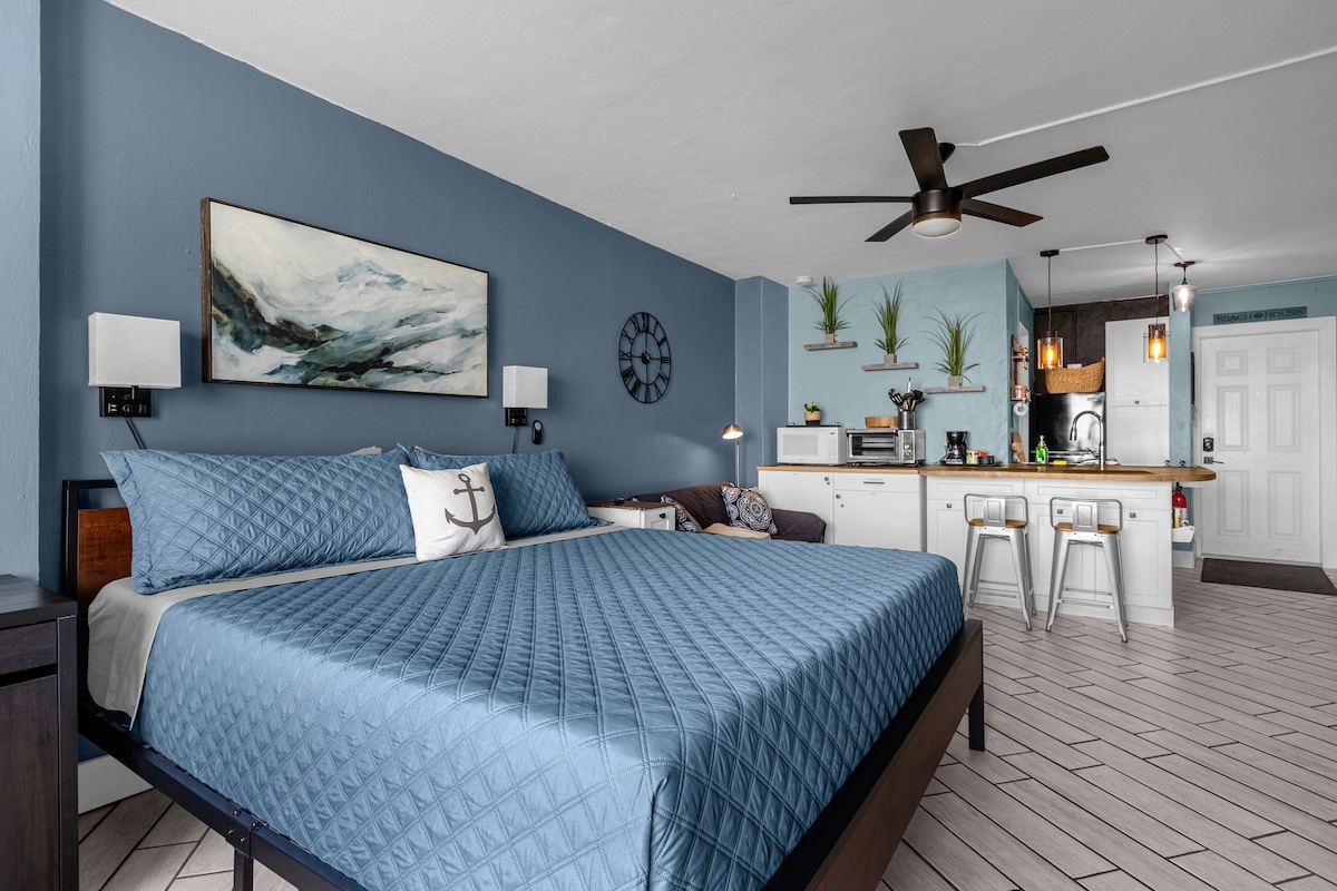 NIGHTLY PRICE REDUCED due to Building renovations restricting our balcony usage. ON THE BEACH! Your very own cozy spacious studio with a private balcony* overlooking the Sand, Surf, and Sunrises. Daytona Shores is the serene beach of Daytona and is just a few short minutes away from a variety of activities and restaurants. Our 3rd-floor unit is completely remodeled with free dedicated 45+Mbps WiFi, streaming channels, a full kitchenette, and free parking. *Unavailable beginning November