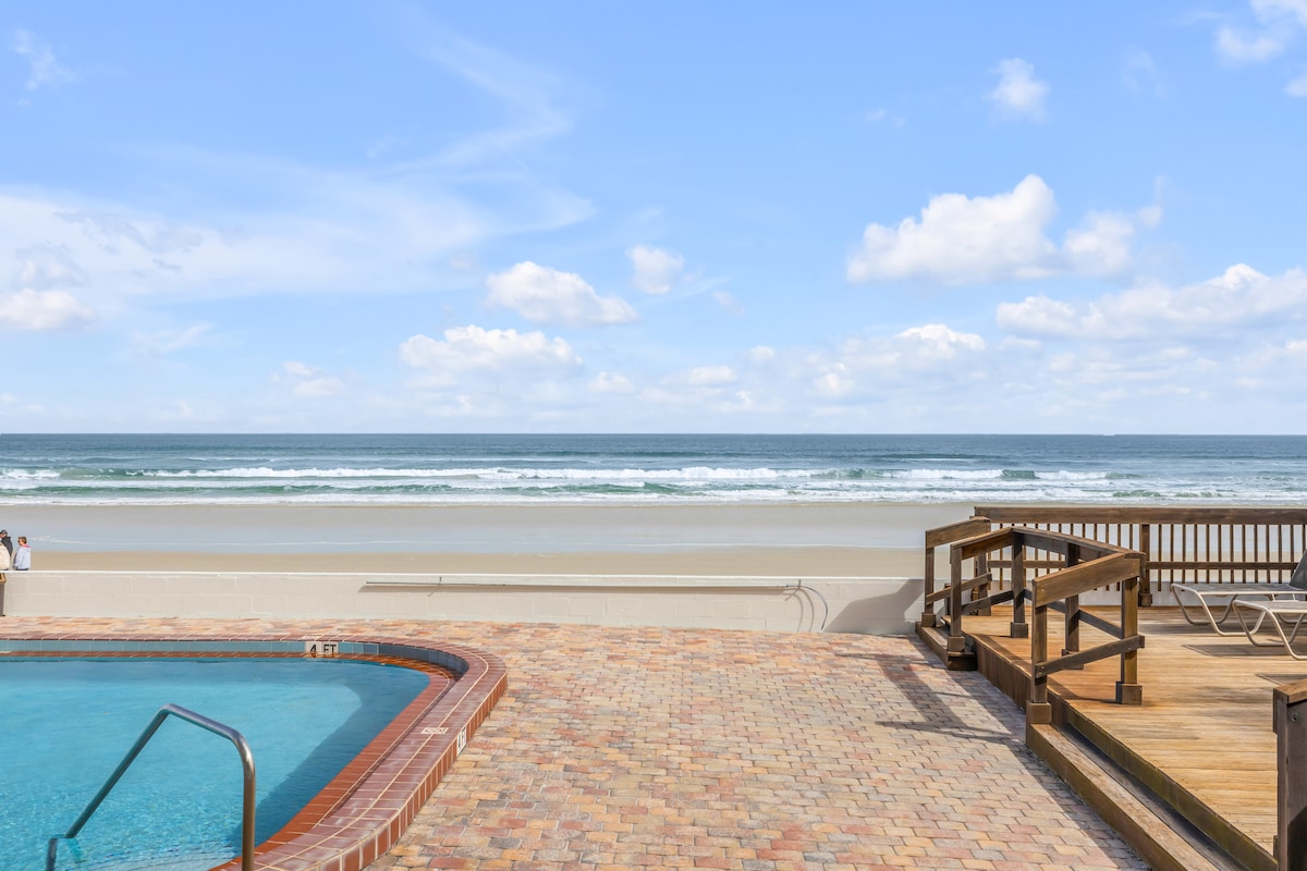 Enjoy our Heated indoor pool We are located on Daytona Beach a 1 minute walk through the pool area to be on the beach. With open pool Netflix Included, Experience our newly renovated King room studio, large balcony with amazing beachfront views it feels like you are on a cruise ship over the ocean. We have all kitchen items needed for cooking and we provide Coffee, cream, sugar .We provide all linens and towels and Beach towels and beach chairs.