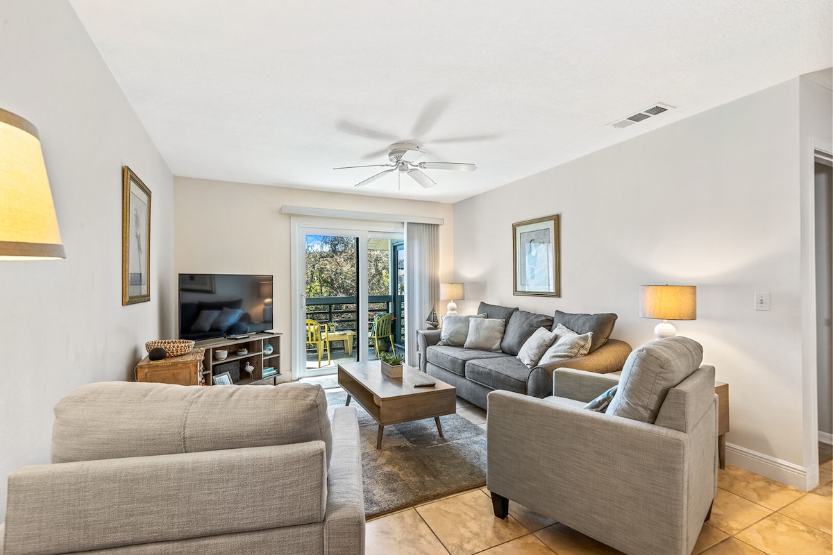 Beautifully updated condo overlooking a tropical courtyard. Just steps off Flagler Ave., hidden inside the courtyard on the second floor is this newly remodeled condo filled with custom beach furnishings and artwork. Home splits off into two separate zones, each containing a bedroom and bathroom. Master bedrooms comforts include a huge King size bed. Large dresser, a 50" 4K HDTV and attached private full bathroom. Balcony view, with love seat overlooking lovely courtyard below.