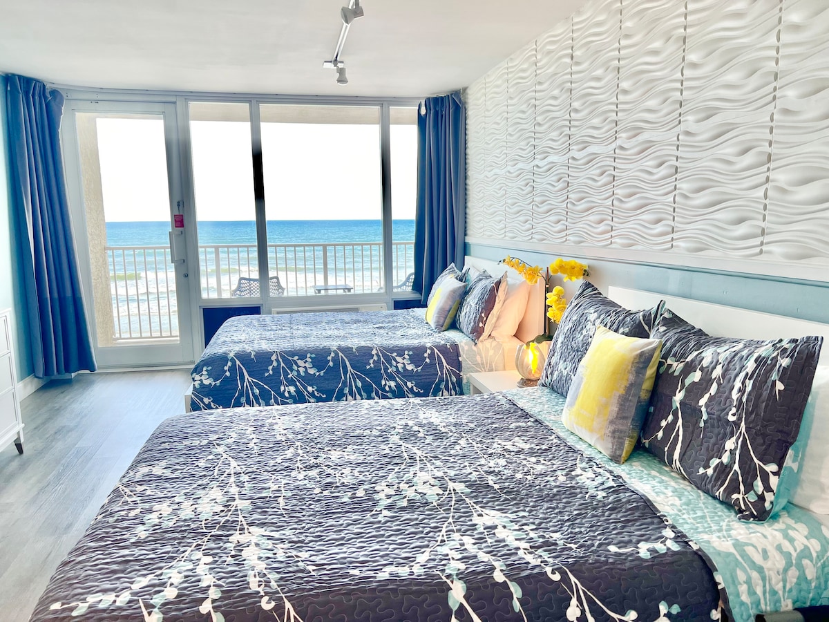 Breathtaking Ocean Views: A full wall of windows provides an incredible northern view of the Atlantic Ocean and Daytona coastline. Ultimate Comfort: Unwind on a brand-new pillow-top king bed. Perfectly Lit: Enjoy abundant natural light or use the light-blocking drapes to create a dark, quiet space for rest. Sunrise & Beach Access: Take in a spectacular sunrise from the pool deck or wander the surf on the beach below. Recently Remodeled and inspired by the soothing colors of the sea and sky.