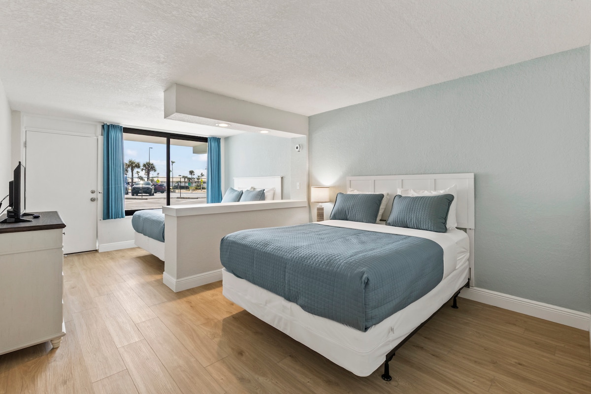 Welcome to your relaxing beach escape just steps from the sand. This newly renovated 2 Queen suite is designed for comfort, convenience, and stress-free stays. Whether you're traveling with family, friends, or as a small group, having two full bathrooms means no waiting and no crowding a rare and valuable feature near the beach. Sleeping Setup • 2 comfortable queen beds • Fresh linens & room-darkening shades • Smart layout ideal for up to 4 guests