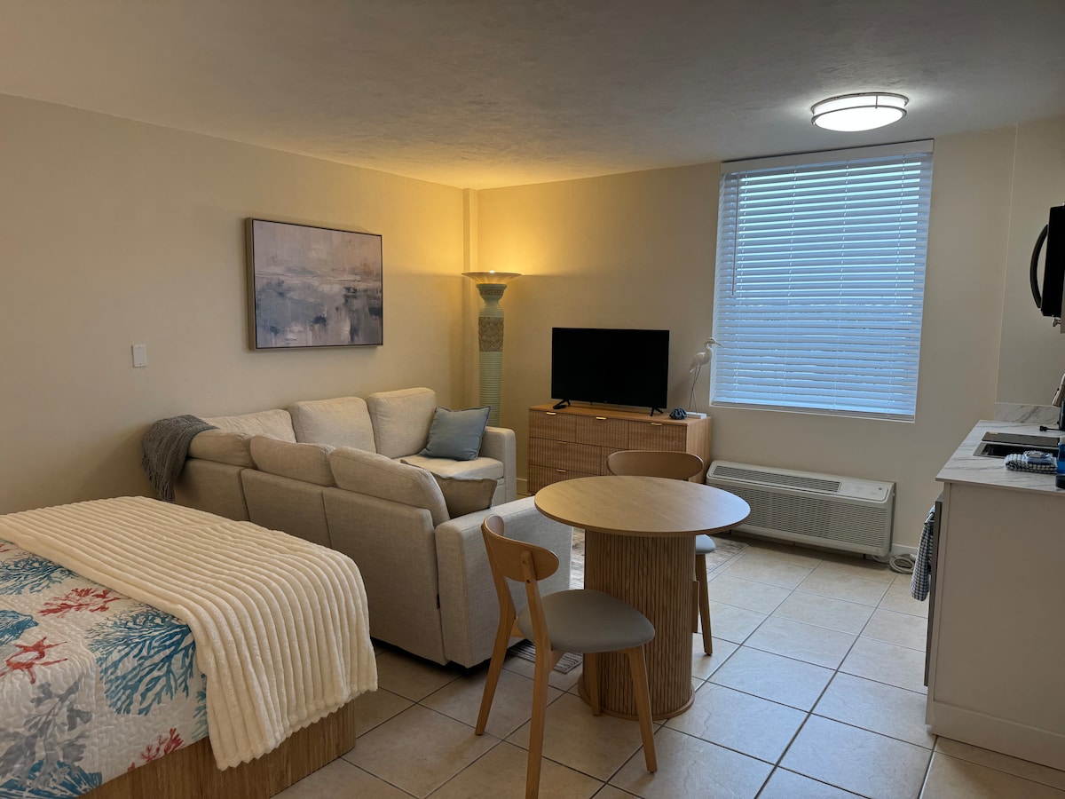 You found it! 🎆 The perfect beachfront 🌅studio condo to watch 😎 listen to the sweet lull of the waves 🌊. Enjoy the beach🏖️, extra large outdoor pool 🏊‍♀️, HEATED 🔥 INDOOR pool, BAR//FOOD located on pool deck. Wonderful location w grocery store 🛒restaurants 🍔🌭🥗🍕🍟🥞🍦🍭 & gift shops easily within walking distance. About 2 miles from Daytona Beach Boardwalk & Bandshell (free music concerts 🎶on Friday & Saturday evenings (Unit can sleep 1-4 persons) Owners are local & look forward to meeting you. 🤗