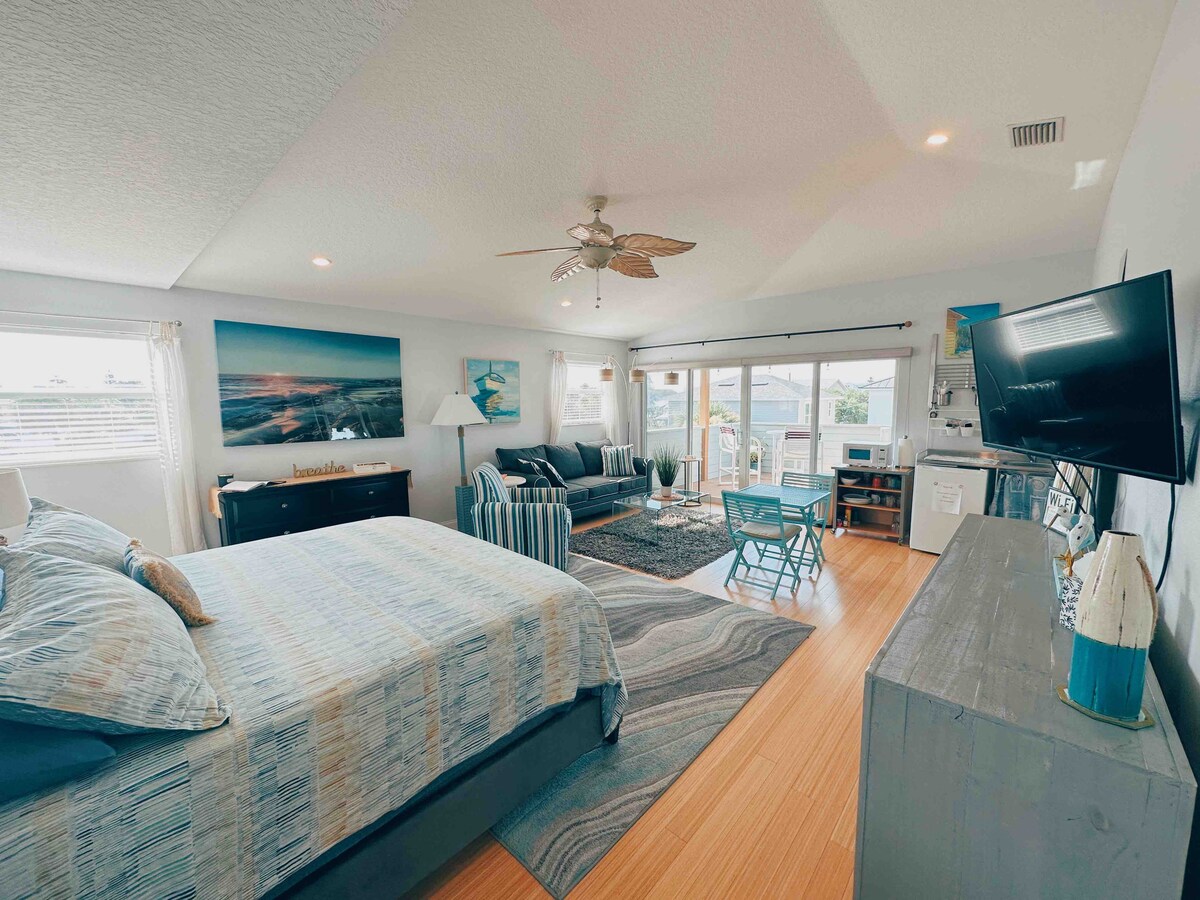 Welcome to Lala's Beach House, where you can walk across the street to the beach! This spacious unit features a king-sized bed, a living room, and a kitchenette. The flex room includes a full-sized bed, ideal for families or small groups. The oversized bathroom boasts a walk-in shower and a charming clawfoot tub. Relax on the balcony, perfect for enjoying the refreshing sea breeze. Just a short walk to the famous Flagler Avenue, with shops, dining, and entertainment.