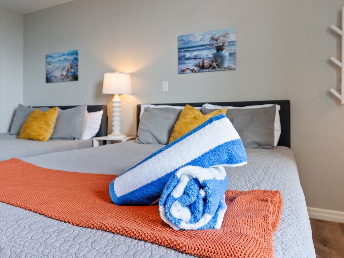 This modern & renovated 375 sq ft condo is located in Harbor Beach Resort & has beautiful sunset views!! The sun often sets as a fiery red circle here, & the sun rises on the beachside in the morning which is only a short ride down the elevator to the beach side. Community pool overlooks beach. There are 2 queen beds, coffee/creamer/sugar provided for you, as well as pool/bath towels with your essential soaps. Smart TV inside.
