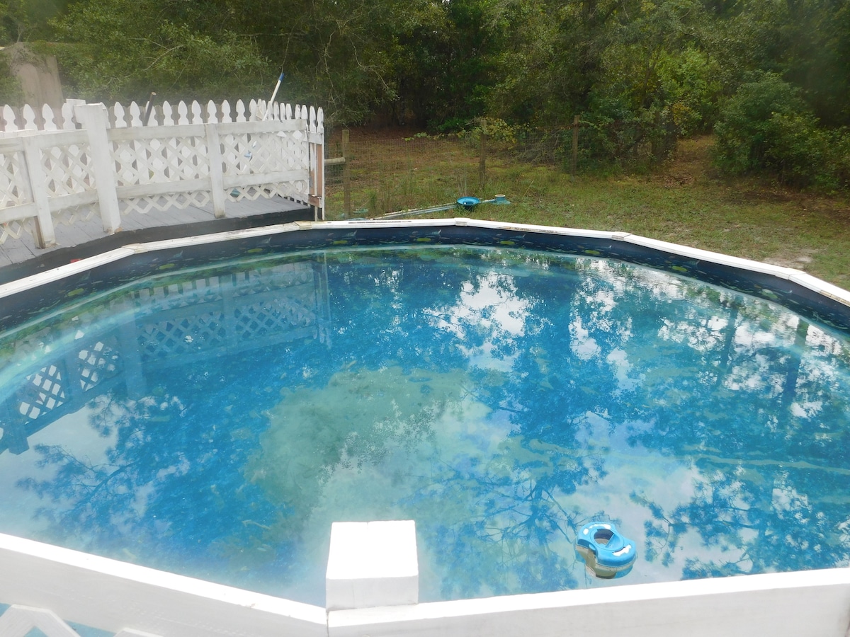 Perfect for hunters, fisherman, "ATV". 4 Bedrooms 2 Baths .SLEEPS 10- above ground pool is located feet away from Ocala National Forest, nearly 400,000 acres . 600 lakes, rivers, and springs . so many endangered species..bring your camera.... hiking, hunting, fishing, horse backriding & ATV trails go on forever. Canoeing is extremely popular.. snorkeling in our many famous natural springs