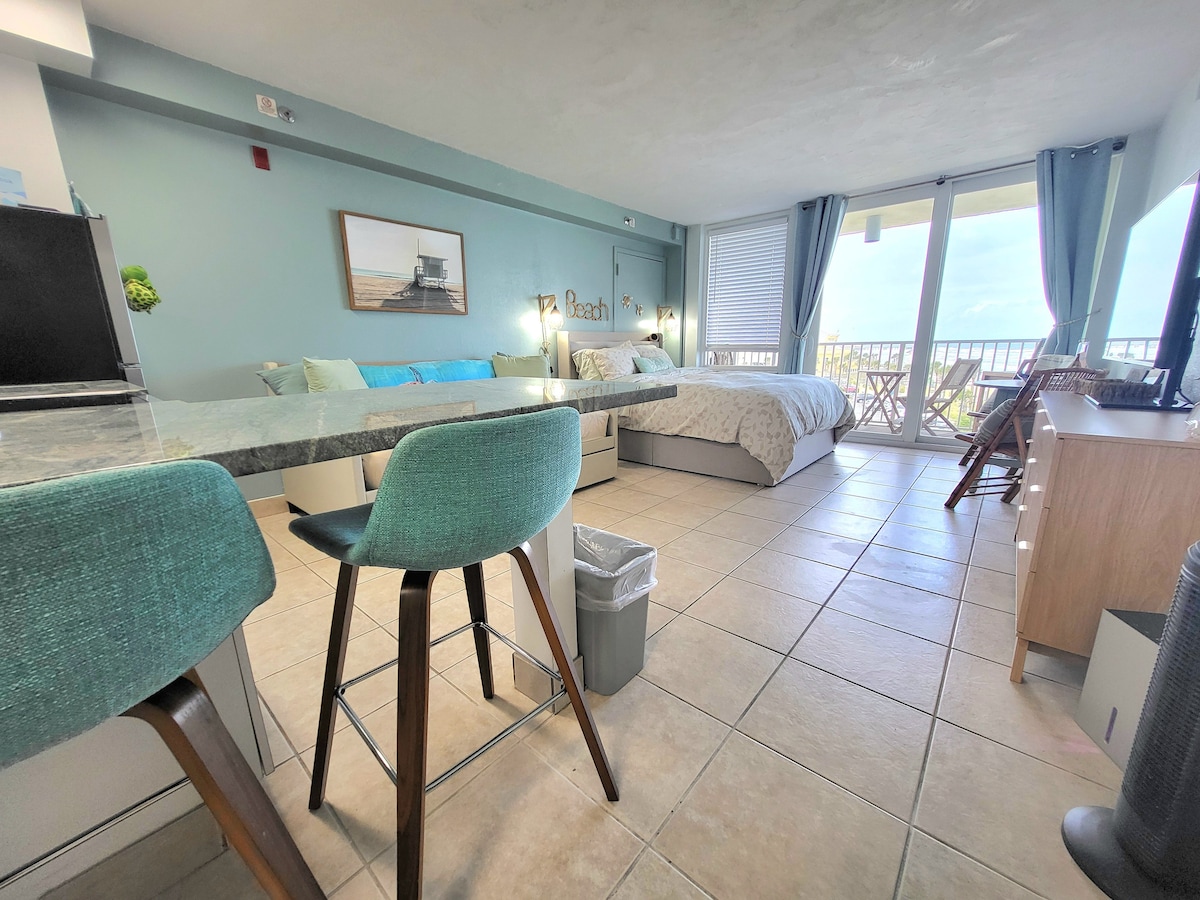 Weekend getaway. Time to rewind? Visit our oceanfront studio. We supply everything you will need! We have beach access, no damage, and an open pool! Safe, quiet building of only 33 units. The OCEAN is located directly in front of this comfy condo, with no roads to cross! This is a remodeled 2nd floor 389 sq ft condo at the Symphony Beach Club. Private balcony and full kitchen no need to leave the premises. This is a DIRECT OCEAN FRONT unit with an ocean view from your private balcony.