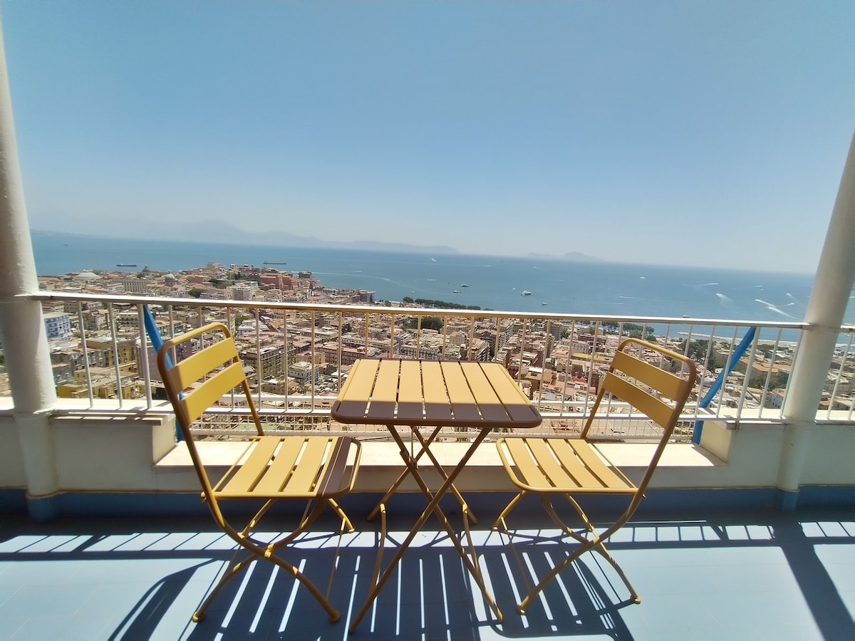 Appartamento incantevole a Napoli città, nella zona del Petraio (antiche scale), situato in un posto tranquillo all'ultimo piano, senza ascensore, con magnifico terrazzo vista mare sul Golfo di Napoli (dal vulcano Vesuvio, all'isola di Capri, alla collina di Posillipo). Ampia e luminosa zona soggiorno con divani e cucina maiolicata, tavoli da pranzo interni e tavolo esterno in terrazza con panorama sul golfo. Zona notte al piano superiore con camera doppia panoramica, bagno e zona studio/relax.