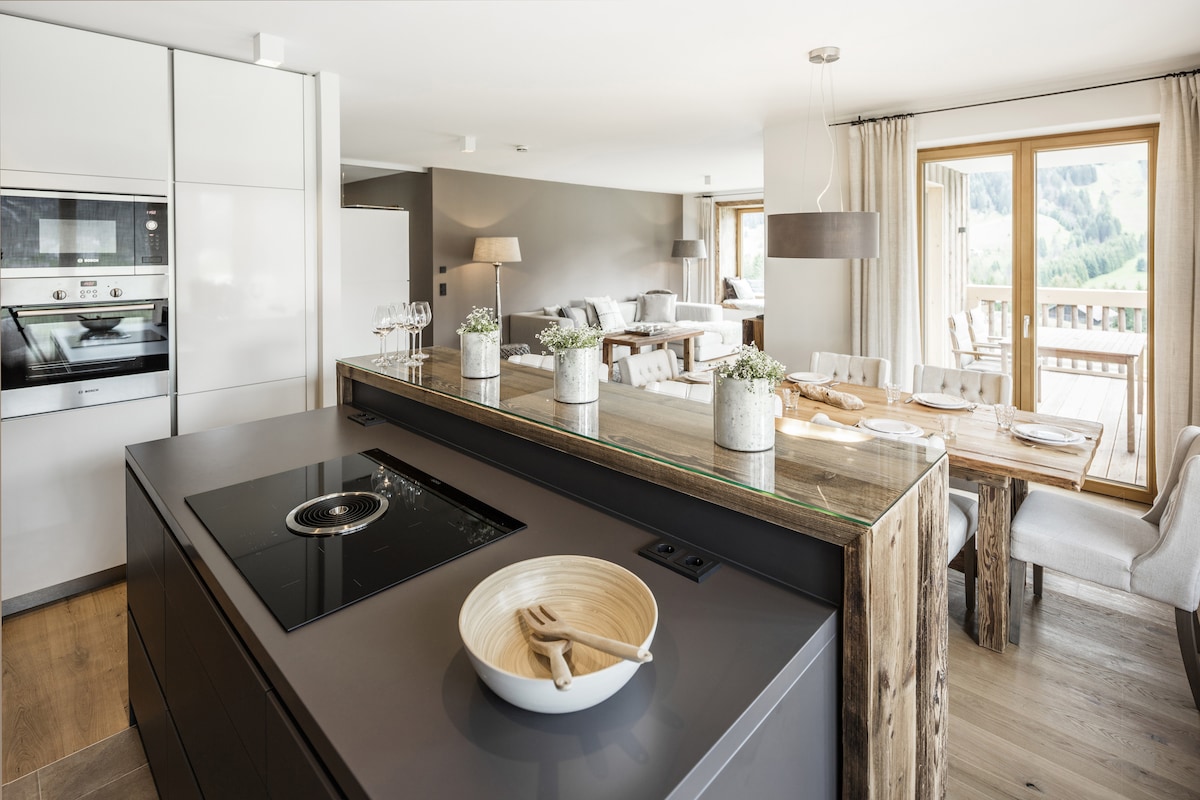 Das Chalet Schwarze Wand verfügt über 115m² und bietet Platz für 7 Personen. - 2 Doppelbetten und ein XXL Etagenbett - Gut ausgestattete Küche: Herd, Geschirrspüler, Nespresso-Kaffeemaschine. - Begehbare Dusche - Ausblick auf traumhaft schöne Alpenwiesen und Berggipfel vom Schlafzimmer und Terrasse. - Ausgezeichneter Wellnessbereich mit 3 Saunas und Pool. - Gratis W-Lan - Skiraum mit beheizten Schränken - Gratis und sicher parken in unserer Tiefgarage