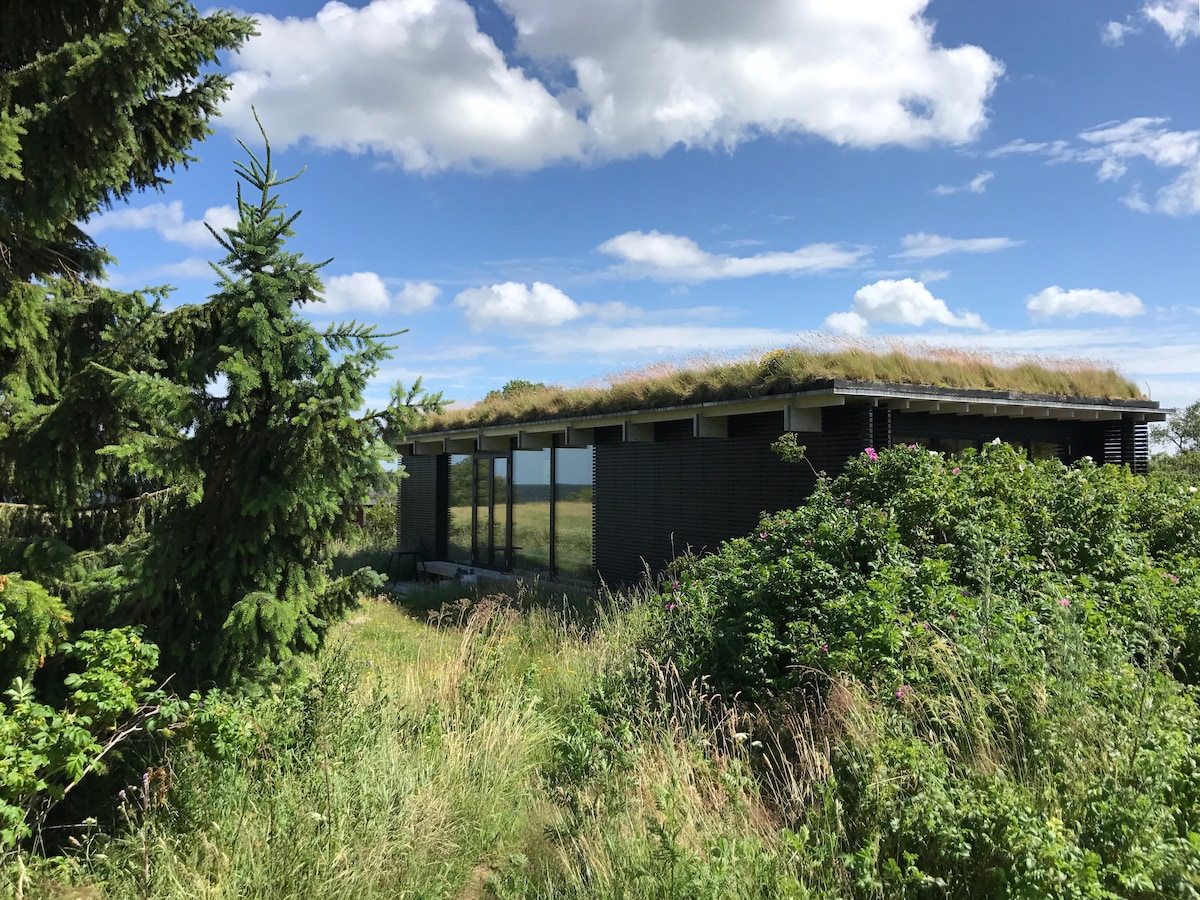 Slap af i et helt unikt, veludstyret og handicapvenligt sommerhus med højt til loftet, usædvanlige vinkler og rum med fantastisk lysindfald. Nyd roen, naturen og havets lyde helt tæt på. Udforsk den store terrasse med hyggekroge, de besøgende rådyr og direkte adgang til sandstrand 100 m fra huset. Oplev solen og den mørke "Dark Sky" himmel gennem husets teleskop og solkikkert. Brug musikinstrumenterne og lydanlæg eller tag en tur i vandet med kano, to havkajakker eller tre paddle boards (SUP).
