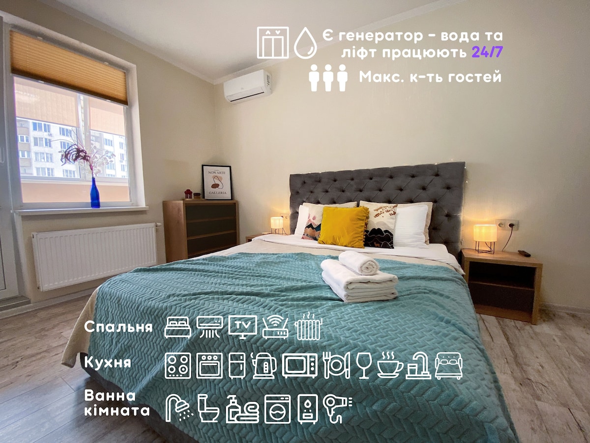 Вас чекає затишна, комфортна квартира-СТУДІЯ, 1 кімнатна , з дизайнерським ремонтом в новобудові. Оснащена всією необхідною побутовою технікою, посудом та меблями , Wi-Fi, є все необхідне для комфортного проживання . Розташована в сучасному житловому комплексі з цілодобовою охороною, озеленена територія з зонами для відпочинку та спортивними майданчиками ,велика зона для паркування , на території салони краси , кафе та продуктові лавки, в 5 хв розташований ліс.