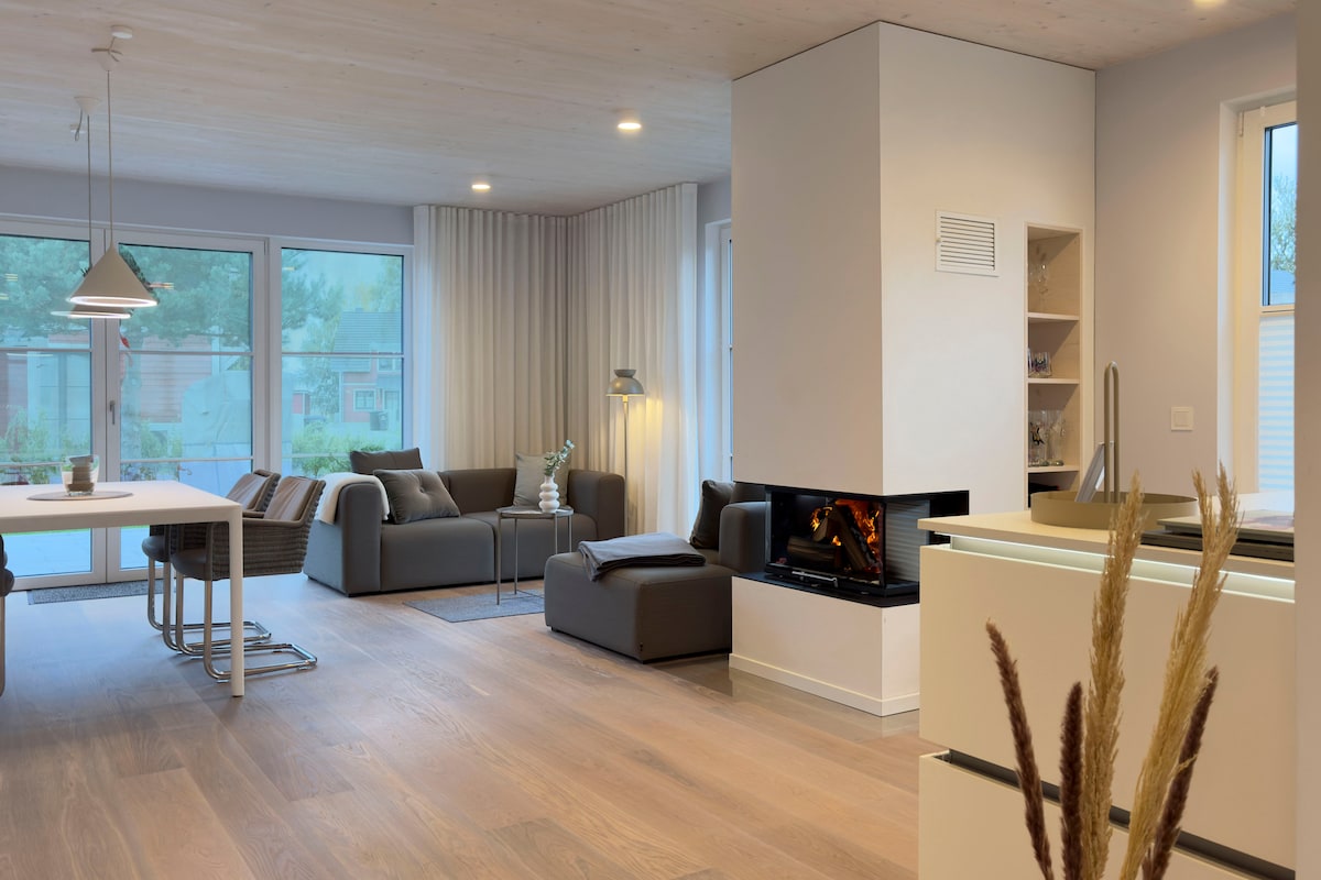 Luxus pur, mit Meerblick (nicht in der Saison),exklusive Ausstattung mit Sauna und Kamin: Kaffeevollautomat Wellnessdusche 56 m² Dachgeschoß für 4 Personen 2 Schlafzimmer mit Doppelbett beide Schlafzimmer mit TV Duschbad großer Balkon Kamin Waschmaschine Trockner barrierefrei bis an den Strand Wellnessbereich Sauna im Dachgeschoß Fahrstuhl Meerblick direkt am Strand Ladestation für E-Autos