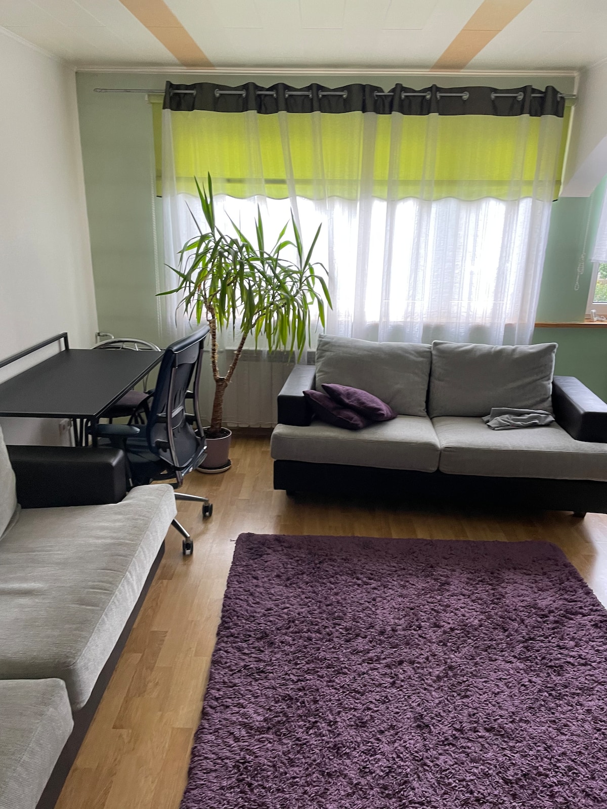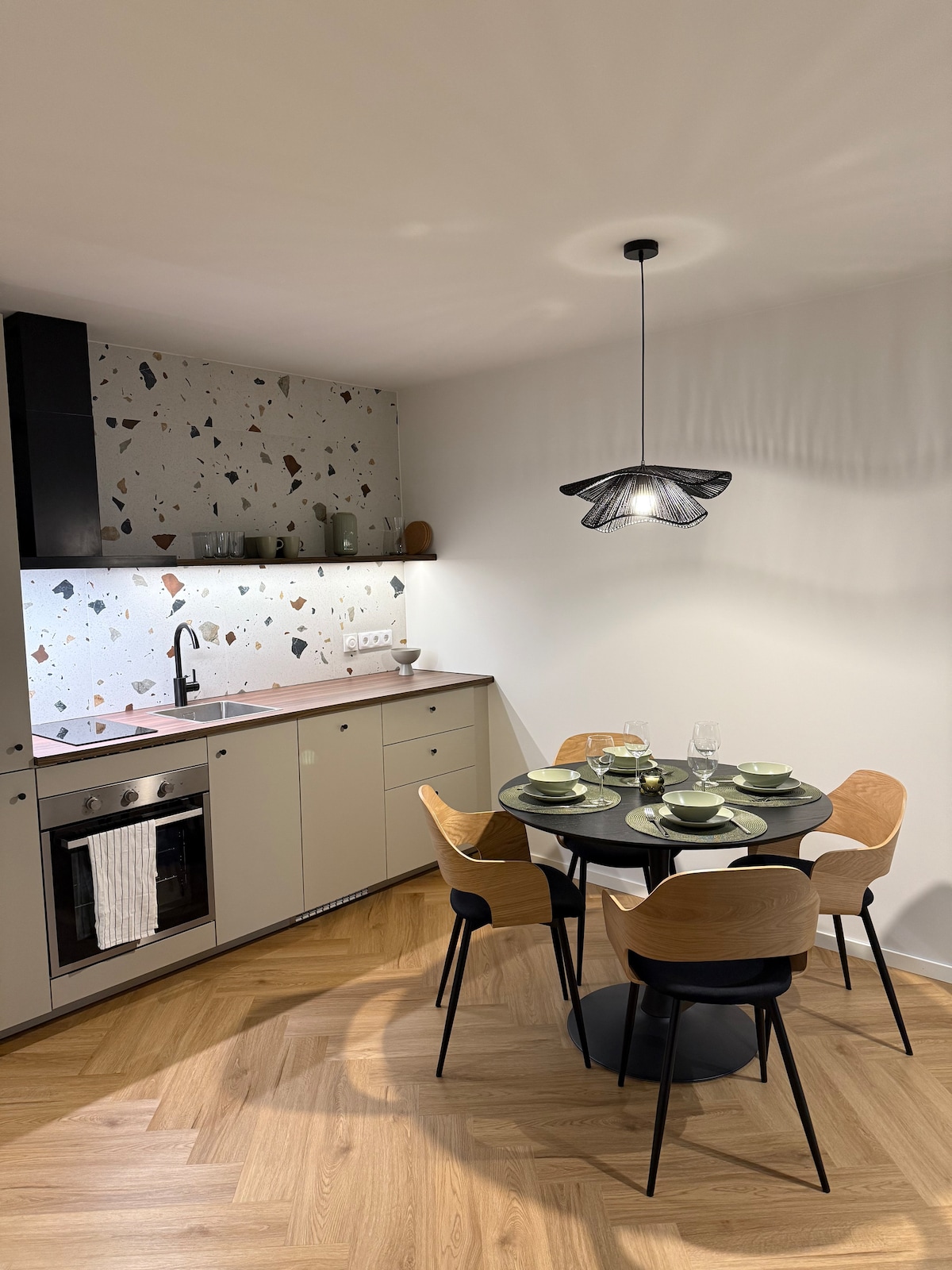 Cozy bedroom with a comfortable double bed, blackout curtains for peaceful nights. Living room features a convertible sofa, a table, 2 chairs, television, and high-speed internet. Fully equipped kitchen, utensils, large fridge, coffee machine, 2 cooking hobs, and oven. Modern bathroom, clean towels washing machine. Proximity to the lake allows easy access for a relaxing stroll. Nearby shops like Coop and Maxima, lively restaurants for daily needs. Free street parking and one rear space.