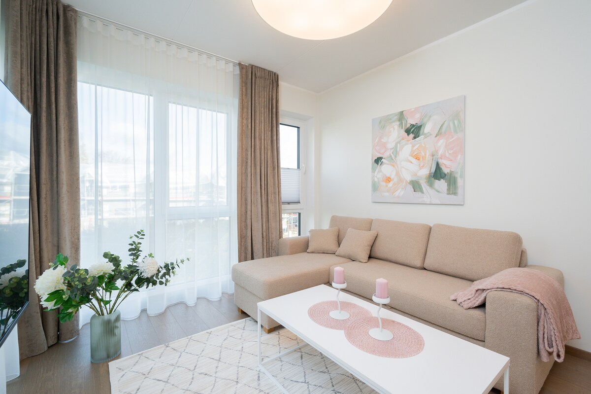 Fully equipped spacious 2 BDR studio vibe apartment with high ceilings and huge windows, from where you can enjoy the beautiful Tamula Lake sunsets. Easy access to the Tamula promenade and beach, groceries and city center.