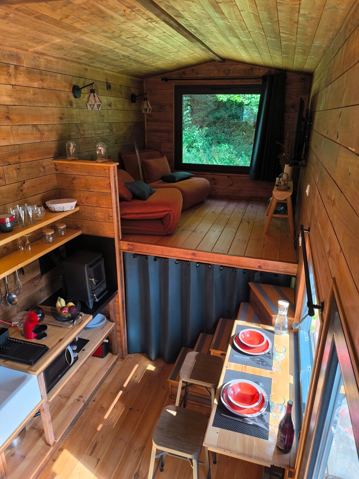 Plongez dans l’atmosphère chaleureuse et atypique de notre chalet en bois cubique sur pilotis, niché en pleine nature avec une vue imprenable sur la forêt. Idéal pour des moments cosy au coin du feu, ce duplex offre un espace parfaitement équipé : une cuisine fonctionnelle, une salle de bain italienne spacieuse, un lit parental. Profitez d’un spa privé, d’un sauna tonneau et d’une cuisine d’été avec braséro pour des soirées conviviales. En hiver, le kota grill vous promet des instants magiques.