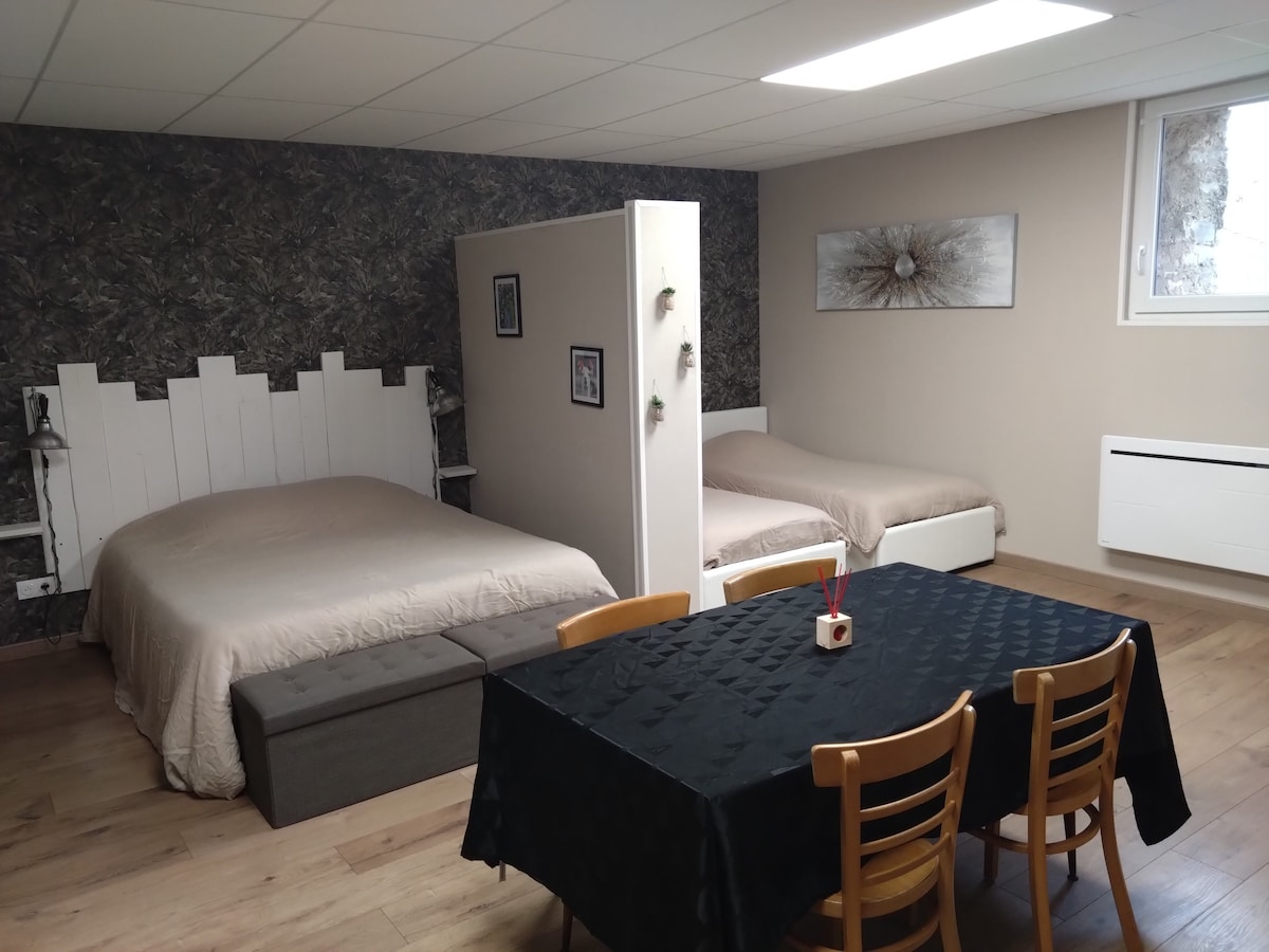 Ce logement paisible offre un séjour détente pour toute la famille. Appartement de type studio situé au 1er étage accessible par un escalier en colimaçon. Entrée au rdc par une pièce avec lave linge et matériel d'entretien. Cuisine équipée ouverte, espace repas et coin salon. Espace nuit composé d'un lit 160x200 et de deux lits 90x190. Salle d'eau, WC indépendant. Préau avec table et 4 chaises. Possibilité d'avoir des serviettes de toilettes en supplément, demande à la réservation.