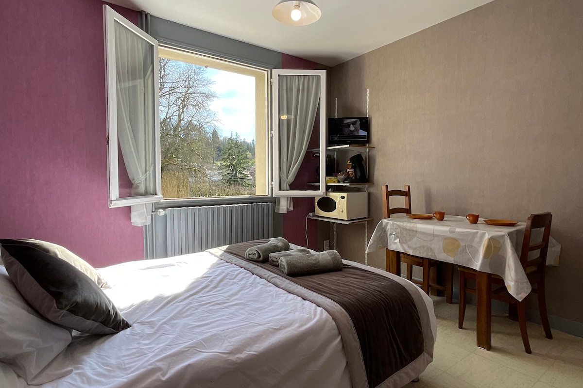 Welcome to our studio nestling in the heart of nature, a haven of peace ideal for a romantic getaway or a quiet break for two. Set in an estate of eight gîtes, our studio offers a warm and intimate setting for your stay. When you arrive, you'll be seduced by the gentle murmur of the stream that runs through the estate, creating a soothing and relaxing atmosphere. The studio is furnished with care and has everything you need to make your stay comfortable.