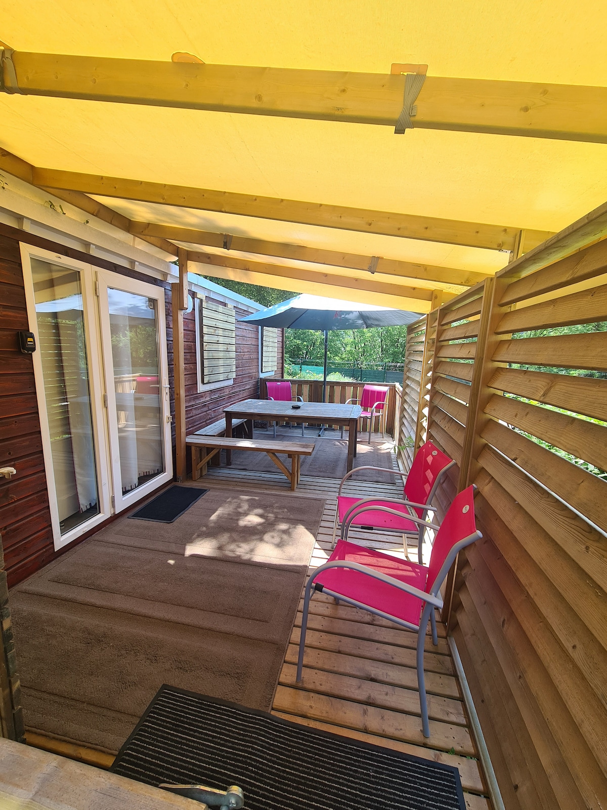 Venez lâcher prise au Camping au sein d'un environnement verdoyant calme et reposant au bord de la rivière la Fecht à Munster qui longe le camping et le sentier pédestre. La terrasse bois pour la détente. Equipé d'une clim, d'un lave-vaisselle, cuisson 4 feux gaz, Frigo/congélateur, divers appareils de cuisson, 1 chambre avec grand lit,1chambre avec petit lit,1 chambre avec petit lit équipent le bungalow. Attention Le linge de maison n'est pas fourni.