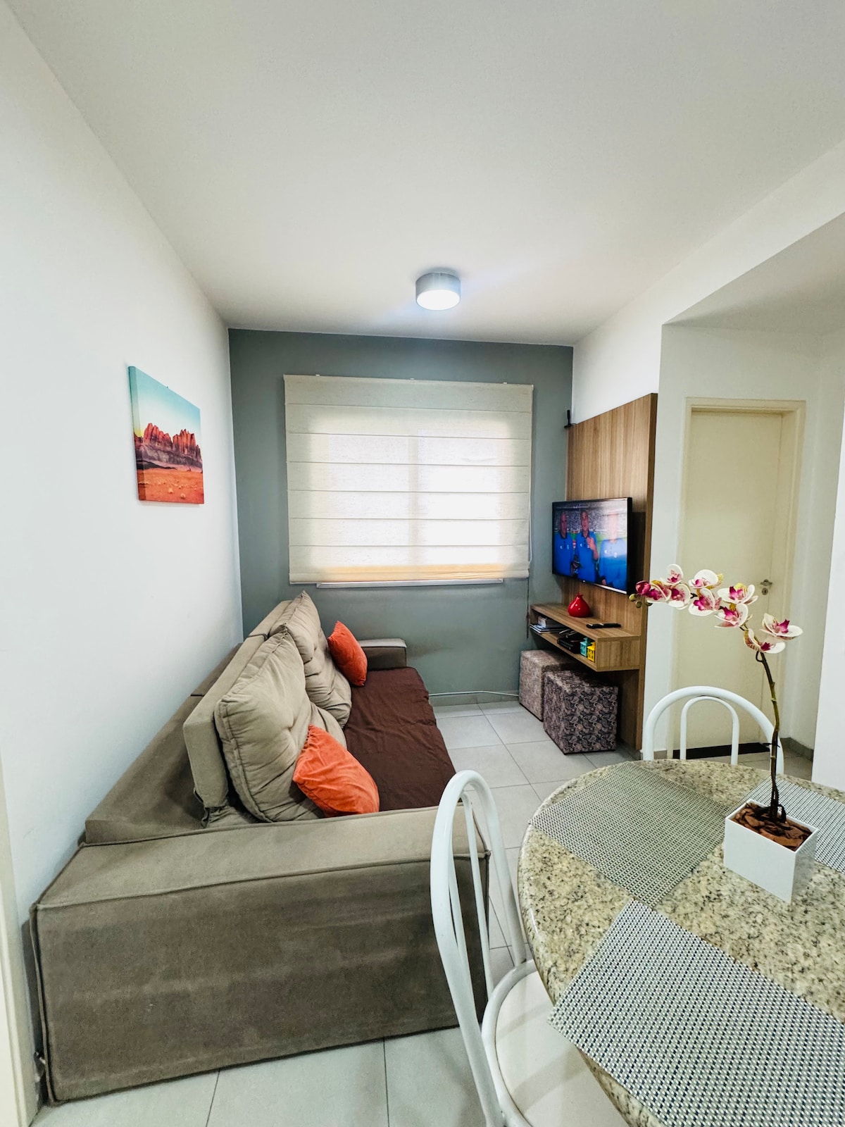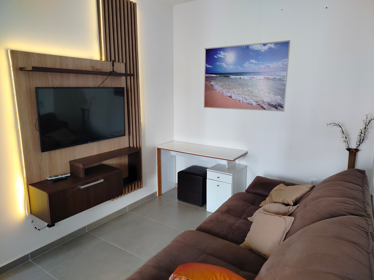 Relaxe neste espaço calmo e cheio de estilo. Apartamento totalmente equipado, com decoração simples e funcional. Nele, você encontrará uma cama de casal na suíte, cama de solteiro no segundo dormitório e um confortável sofá-cama na sala, acompanhado de TV Smart de 50" com internet de alta velocidade e canal Globoplay disponível. Há um espaço dedicado ao home-office e uma varanda deliciosa com vista incrível da cidade, perfeita para apreciar o pôr do sol.