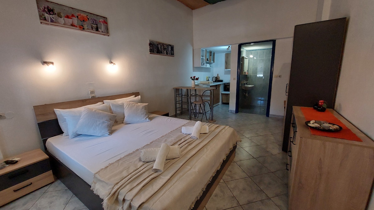 One of two self contained apartments with fully equipped kitchenettes available to rent. 2 km from the main port of Patitiri and just 0,5 km from the village of Votsi, which has a mini supermarket and some good tavernas and restaurants near the harbour. Private off road parking. Each apartment has the facility to accommodate a third family member to be arranged with the host. In season the local bus can stop outside. Ideal for solo, couples, and business travellers. Have a great stay, George.