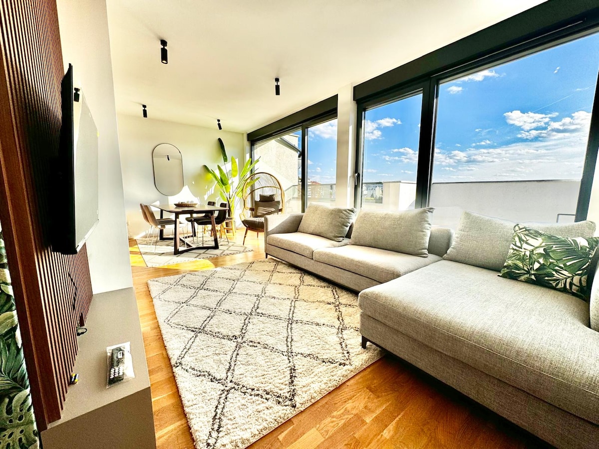 “Belgrade Penthouse” is a luxury apartment on the roof of one of the 10 highest skyscrapers in Belgrade. The area of 90m2 has a panoramic view of the whole city. Apartment is located between most important sports, convention, hotel, cultural and entertainment destinations. These are the largest sports center “the Belgrade Arena”, the largest congress center at the Balkans–Sava Centar,Hotels Hyatt Regency,Crowne Plaza and Holiday Inn,famous Sava river floating restaurants, clubs and discotheques.