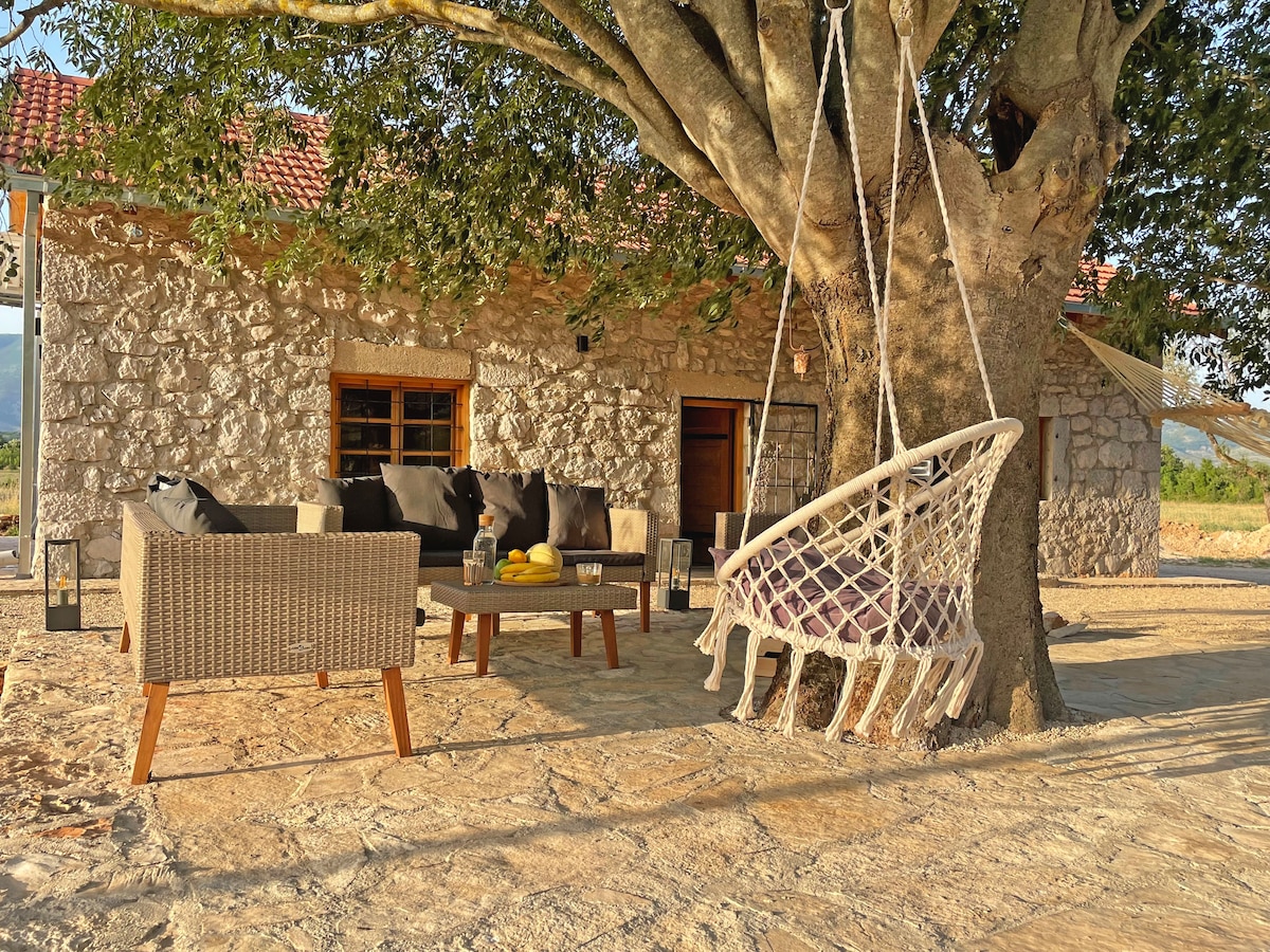 Moderno obnovljena stara kuca od kamena, u ruralnom dijelu, okruzena velikim plantaza etericnog bilja. Prostrana terasa i lijepo uredjena okucnica, idealna su za odmor. Kuca ima veliki dnevni boravak sa kuhinjom, kupaonicu i spavacu sobu. U spavacaj sobi se nalaze dva krevata (180x200 i 160x200) i dva pomocna kreveta na rasklapanje (90x190).