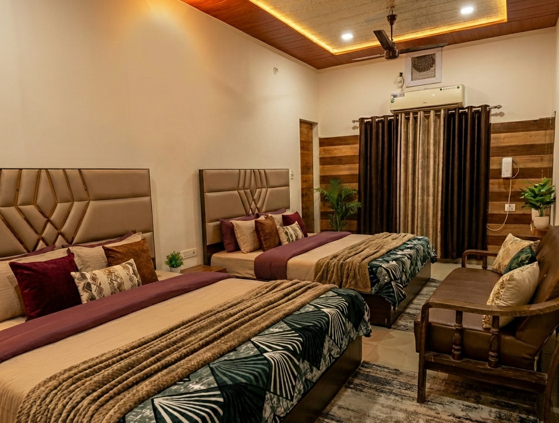 Vrindara Niwas rises in the heart of Mathura like a quiet whisper of luxury—minimalist in spirit, yet rich with the soul of a royal haveli. Here, earthy textures meet clean lines, creating a home that feels both timeless and effortlessly chic. Its four serene bedrooms open into spaces that catch the golden glow of morning light, while the beautiful terrace becomes your private perch over the city’s skyline—perfect for sunrise chai or conversations that stretch into starlit silence.