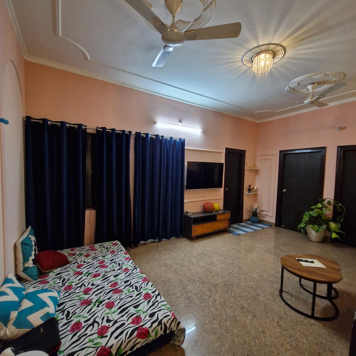 *Relax and unwind in this peaceful & luxury apartment with unique decor,ideal for couples or a family of three. Enjoy modern comforts with easy access to Vrindavan’s temples and attractions. *Premanandji padhyatra darshan-400m away (walking distance 5 minutes) *Start your day with yamunaji darshan & peacock sounds with beautiful sunrise from cozy balcony.Sink into a comfortable bed with positive vibes.