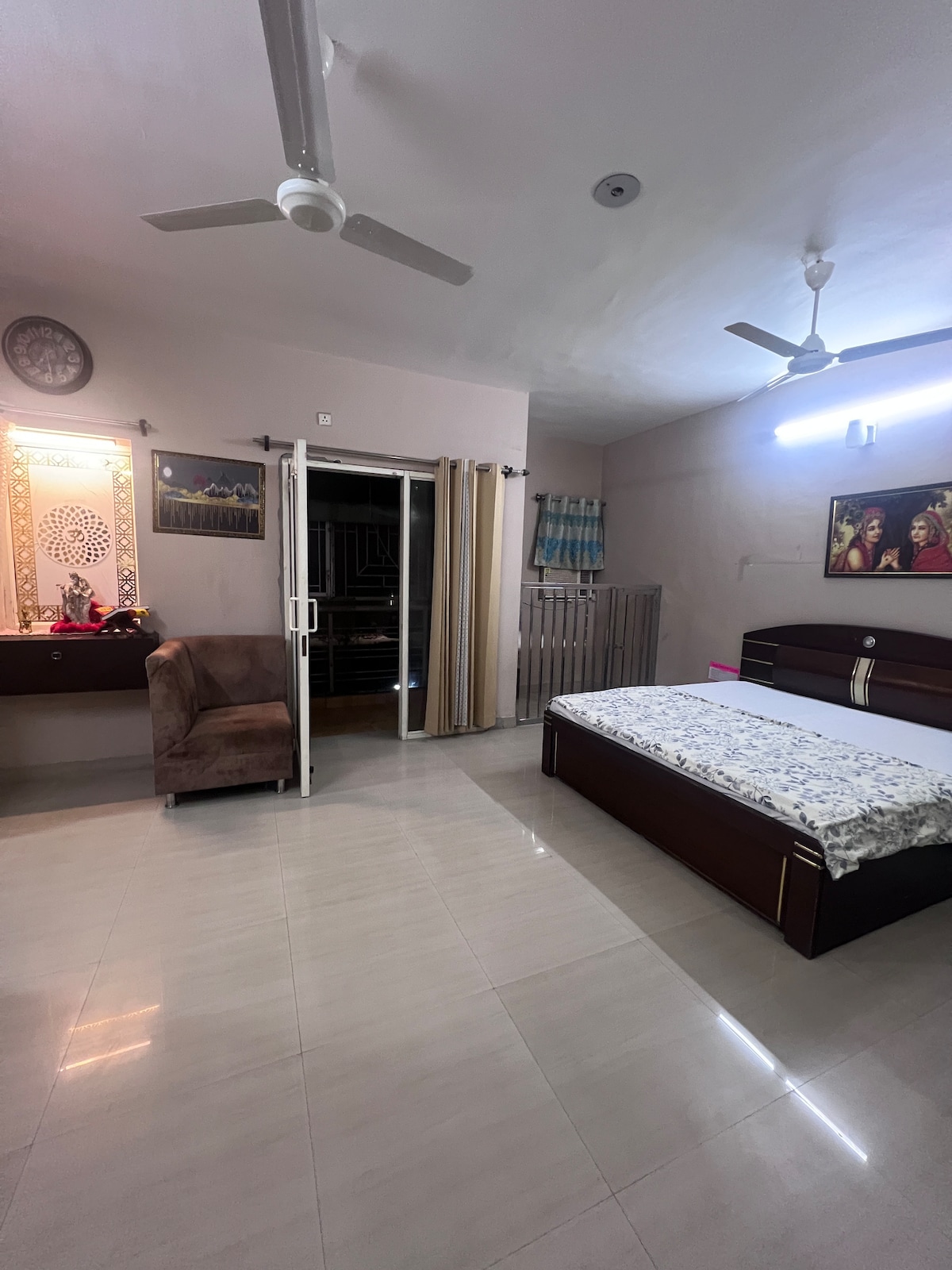 A peaceful 1BHK stay just 1 KM from Prem Mandir 🌸 Enjoy serene views of Prem Mandir and Char Dham from the balcony, along with one of the best sunsets in Vrindavan. The home offers peace, comfort and a dedicated meditation space for a soulful stay. Perfect for families, couples and groups to relax and soak in the divine energy of Braj. 📌 Note: Two-wheeler 🛵 is available on rent in the property parking for easy local travel.