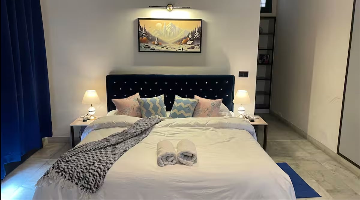 Beautiful 3BHK unit featuring 2 washrooms, a living room, a kitchen, and a well-ventilated balcony. Fully furnished with 3 double beds, 2 single beds, and a comfortable sofa. Ideal for families or groups, ensuring a pleasant and spacious stay. Designed to offer comfort, convenience, and ample space for all guests. Number of rooms would be provided according to number of guests. Up to 6 guests, only two bedrooms will be provided.