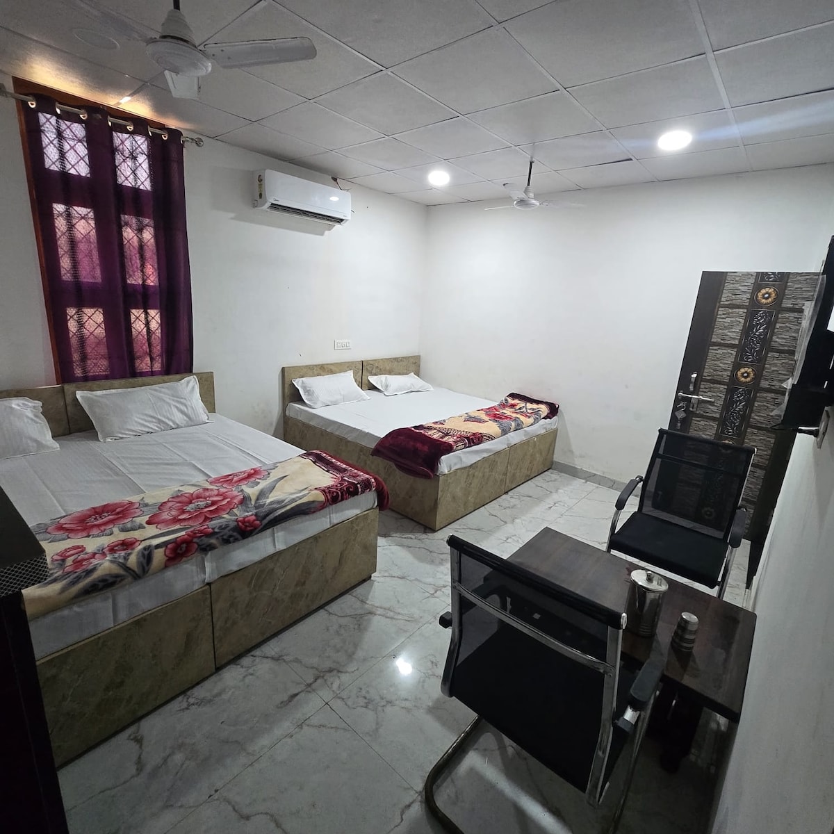Relax with the whole family at this peaceful place to stay. Only 150 Mtrs from Famous Shri Banke Bihari Temple, Next to Shri SnehBihari Temple. You can join the Darshan Que right next to building. Real place to stay in real Vrindavan, Situated in Kunj Gali's of Vridavan, Peaceful Place. New building with nice and calm Interior work, All rooms have efficient AC with attached bathrooms and lift available at for all floors. Local Guide available 24hr, Brij Darshan Tour facility is also available