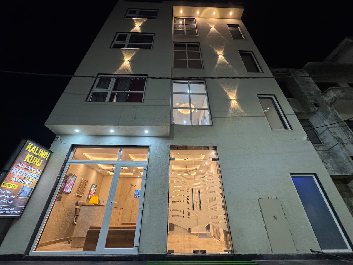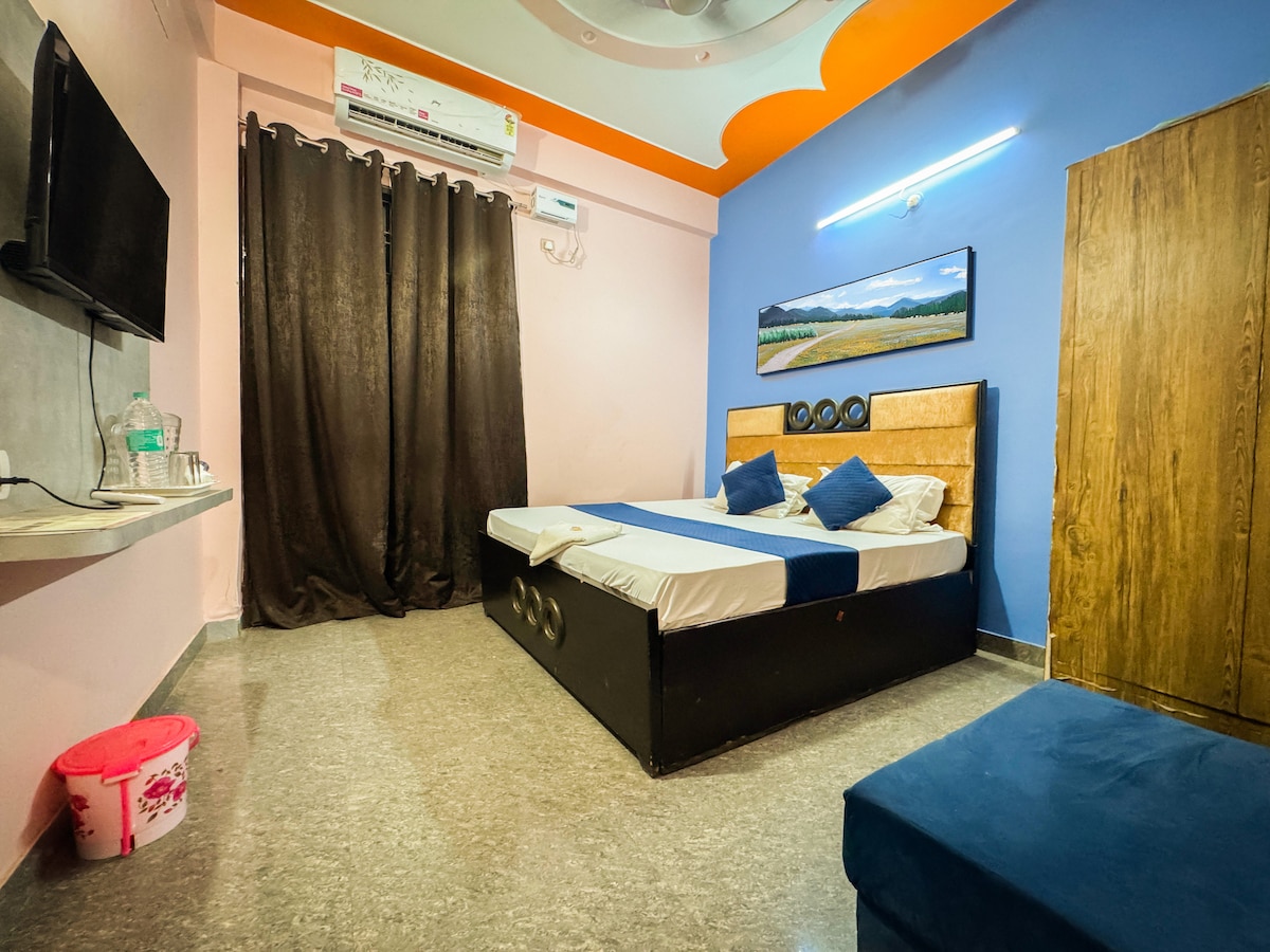 Peaceful modern stay within walking distance of Prem Mandir and Iskcon Temple. Comfortable king-size bed, AC, WiFi, and clean attached bathroom. Perfect for families, couples, and pilgrims seeking comfort near the temples.
