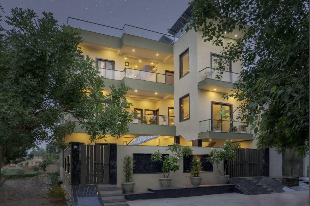 Vrindavan's Stunning Luxurious Suite - tasteful colors, corners & more 📍 Prime Location: ✔ Prem Mandir – 3 km (10 min) ✔ ISKCON Temple – 3.5 km (12 min) ✔ Banke Bihari Temple – 4 km (15 min) ✨ Why Stay Here? ✔ Luxurious box-style bed for ultimate comfort ✔ Inspired by Rajasthan’s folklore & vibrant culture ✔ 24x7 Lift | High-Speed WiFi | Fully Stocked Amenities Discover a unique blend of urban luxury and Indian heritage in this 11th-floor designer suite with breathtaking views. Welcome Home!