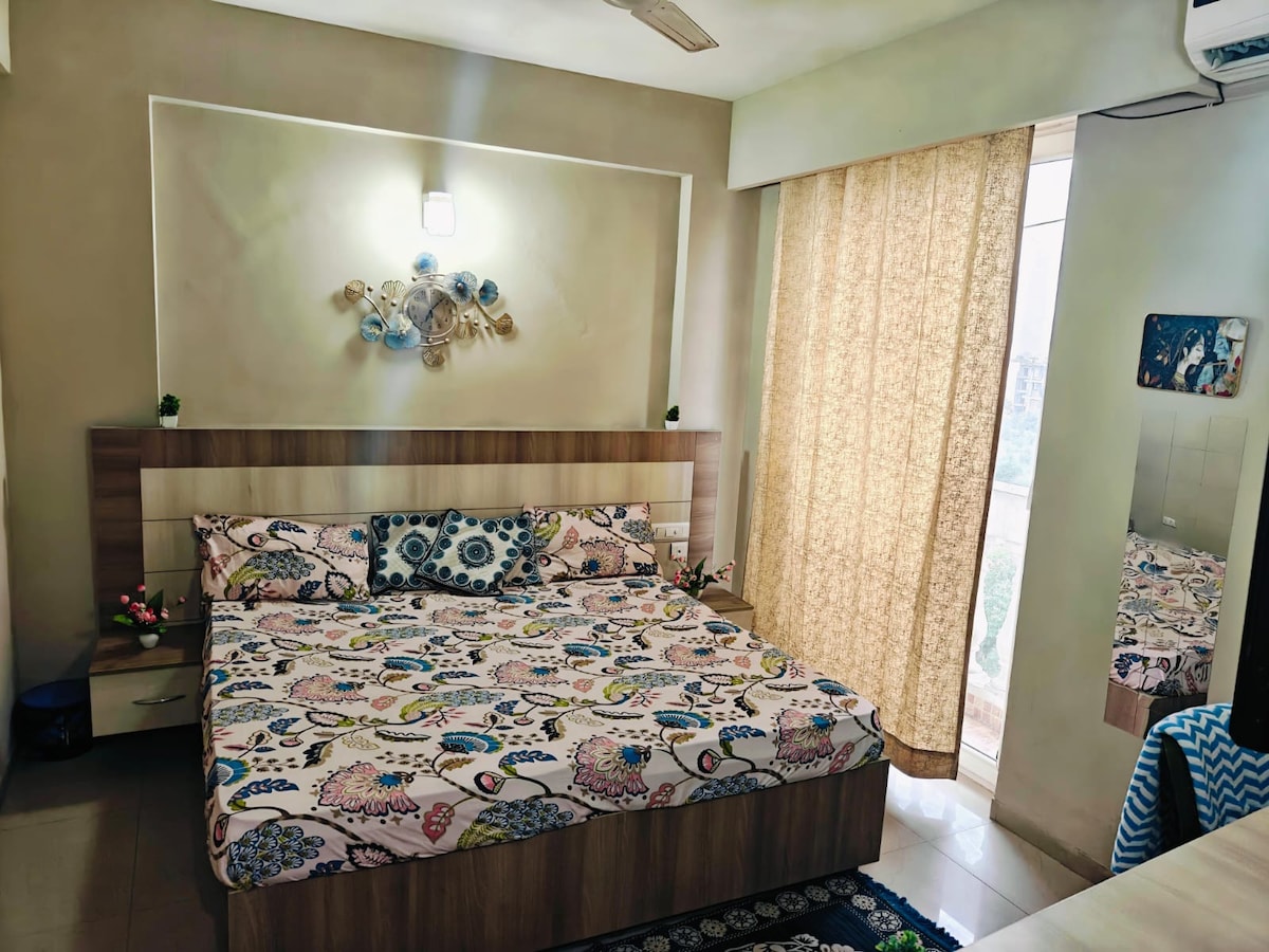 Well-equipped studio apartment in Vrindavan offers luxury and comfort in a posh gated society. 🛏️ Comfortable & Relaxing Stay •Spacious studio apartment with a private balcony and soothing garden view •Fully equipped kitchen for self-cooking •Modern attached bathroom with essential amenities 📍Prime Location •1.5 km from Prem Mandir •2.5 km from ISKCON Temple •4 km from Banke Bihari Temple •All major temples within a 5 km radius Enjoy spiritual proximity without the noise and crowds.