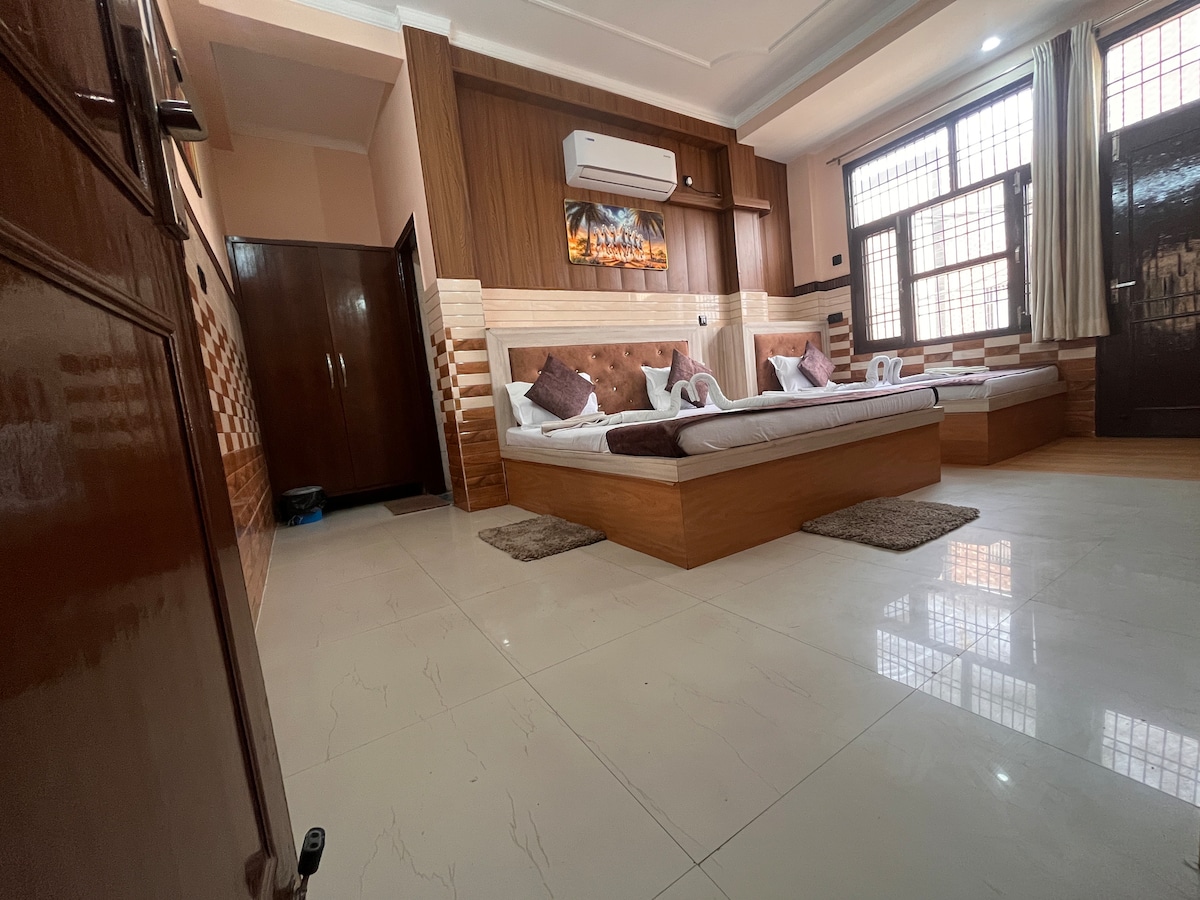 Shree Vrinda is a peaceful & spacious villa stay in Vrindavan near Prem Mandir, ISKCON, Bankey Bihari temples, Premanand Maharaj ji Darshan route, thoughtfully designed for families and spiritual travellers very ideal for pilgrimage visits. This 1BHK (Sleeps 4) with Optional 2BHK Setup, featuring a bedroom with walk-in closet, a separate sitting room with sofa-cum-bed, kitchen, dining space, and excellent ventilation. Enjoy open seating in front and back, free parking, and a safe neighbourhood.