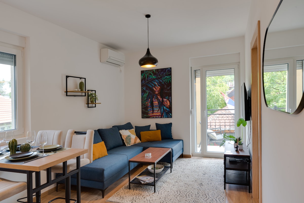 Bright and stylish apartment in central Vrnjacka Banja, featuring lift, parking, panoramic views, and a large terrace - ideal for working, creating content, unwinding, and family-friendly with little ones.