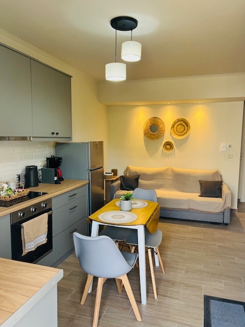 A private rooftop escape in the heart of Chios town! This modern studio apartment offers a peaceful stay with a stunning panoramic view of the Aegean Sea. It's highlight? A huge private terrace with lounge chairs, dining table, and breathtaking views of the sea and sunrise. Ideal for solo travelers, couples or digital nomads looking for comfort, calm, and convenience – all just steps away from cafes, shops, and the port.