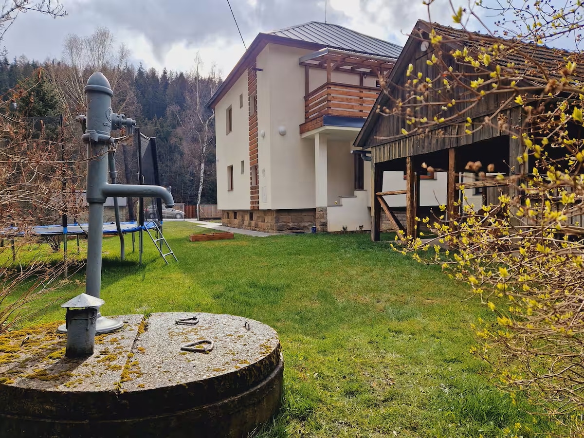 Ubytování v tichém údolí Paleskového potoka s krásnými výhledy na náš sad a okolní kopce. Náš domek je poctou krajině a čisté, moderní architektuře. V případě větší skupiny je možno pronajmout i druhou chaloupku. Na pozemku je parkování pro 3 auta. Větší stavení je pro 6-8 osob, druhá chaloupka je pro 3 hostů. Stavení: 2 ložnice a otevřená galerie. Plně vybavená kuchyň. Koupelna se sprchovým koutem, WC, pračka. Chaloupka: Ložnice a galerie Spodní patro má postel, a kuchyň Sprchový kout, WC
