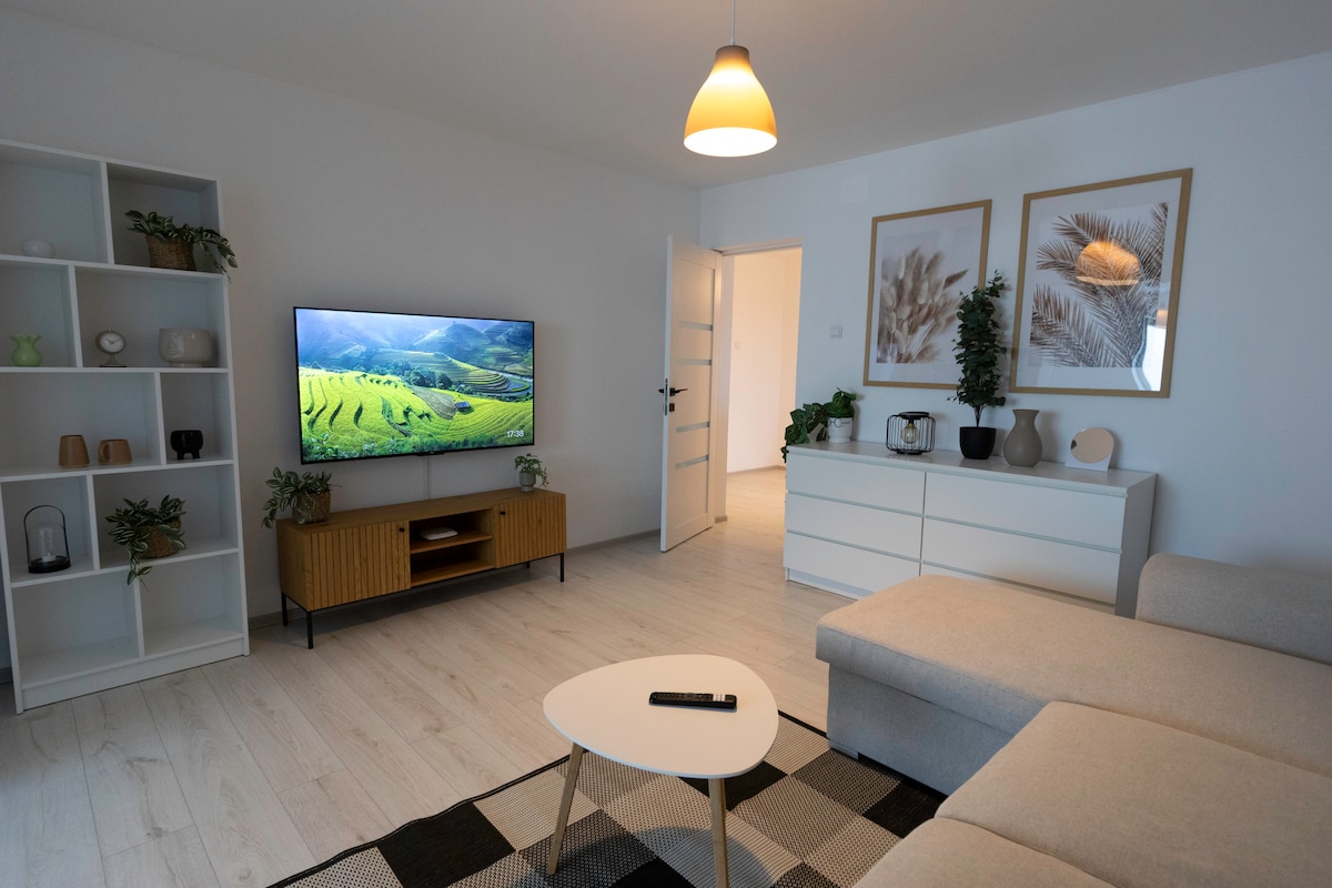 Amazing newly refurbished 2 Bedroom apartment just 5 minutes drive from Focșani! Welcome to our little nest, which can accomodate up to 5 people, with following rooms : ● 2x Double Bedrooms ● 1x Kitchen with Dining Area ● 1x Huge Living Room ● 1x Bathroom + Additional Toilet Room ● 2x Balconies facing our charming little town The apartment sits just 5 minutes drive from main town Focșani and is also connected with bus to the city center. Shops 2 minutes walk Feel free to feel right at home!