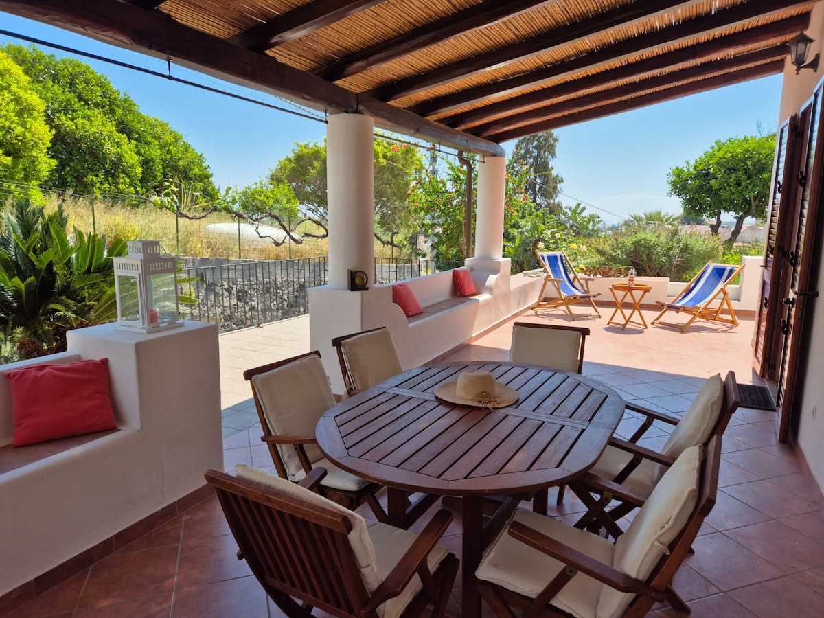 The house is located in the area called 'Cappero'. The house was originally built in 1900 and was refurbished in 2012. It is a traditional Aeolian style villa. Facing the front yard is a wooden awning supported by Aeolian style pillars called 'pulera'. The seafront terrace overlooking the Vulcano Island is surrounded by a low-rising platform called 'bisola' delicately adorned with Sicilian ceramic tiles. The house is surrounded by 1500 square metres of garden space.