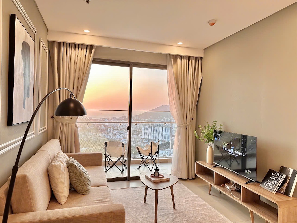 Minimalist, fully furnished 1BR apartment on the 15th floor with spectacular sea views. Ideal for couples or families with one child under 5. Perfectly located beside the Back beach (Thuỳ Vân beach). Estimated walking times to nearby amenities: - 2 minutes to reach the beach across the street - 5 minutes to the nearest 24/7 convenience store (GS25) - 8 minutes to the nearest supermarket (Lotte Mart) Fast elevators. Free Netflix. We also have one motorbike available for rent.